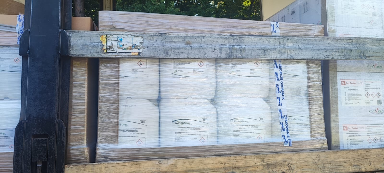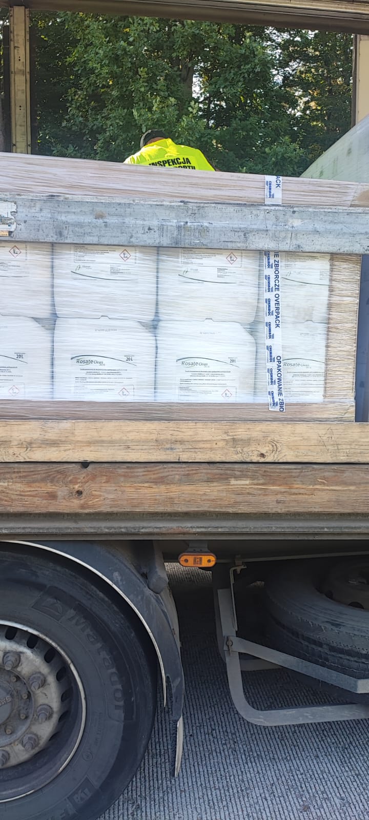 Podczas oględzin ładowni pojazdu stwierdzono przewóz towarów niebezpiecznych, które ze względu na ilość (3520 kg) wymagały oznakowania jednostki transportowej tablicami barwy pomarańczowej, w które w/w zespół pojazdów nie był wyposażony. Towar nie był również w żaden sposób zabezpieczony przed przemieszczeniem. Ponadto, kierowca nie posiadał szkolenia ADR oraz wyposażenia niezbędnego w tego rodzaju przewozie, a data ważności gaśnic upłynęła ponad 3 lata temu.