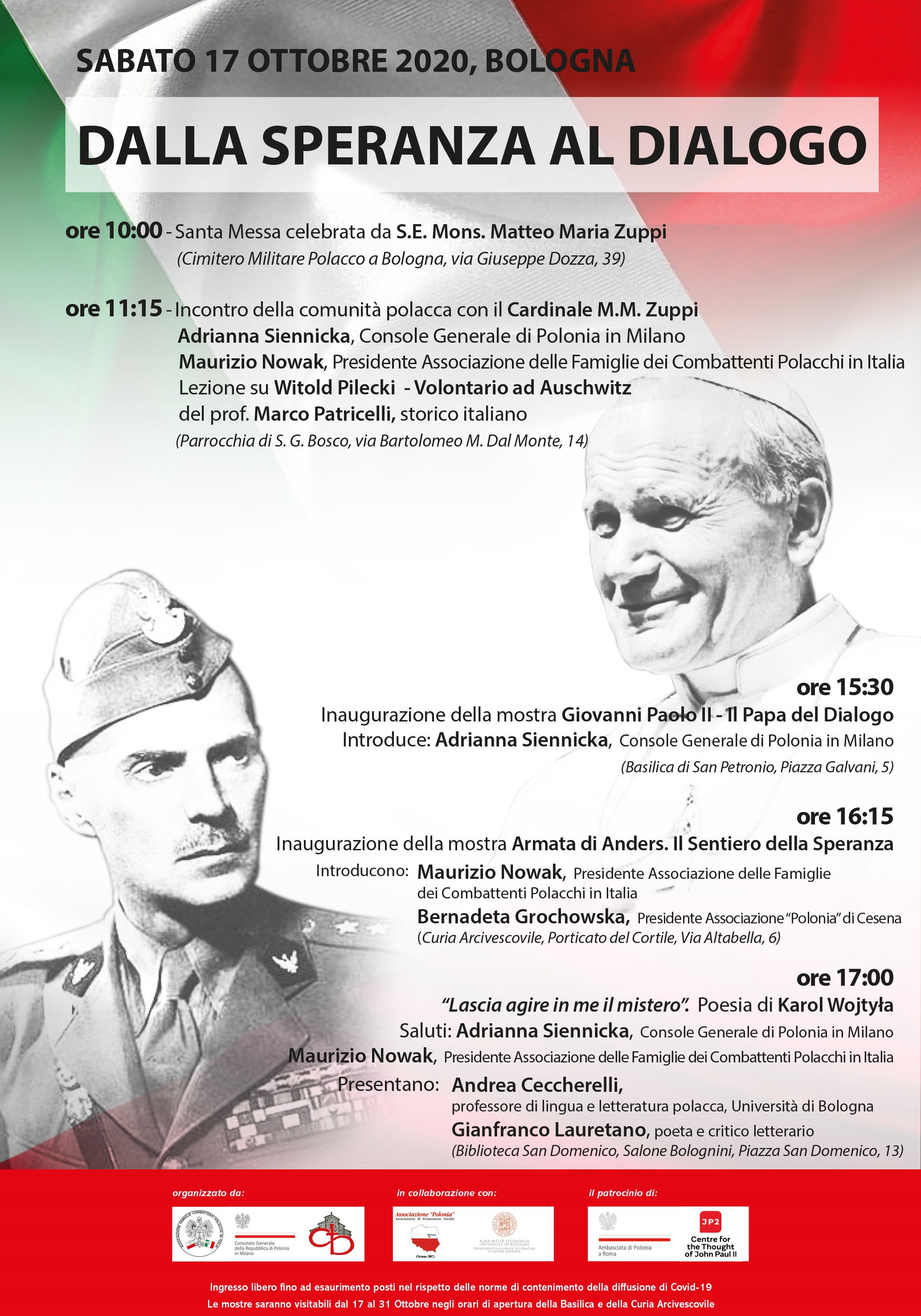 Zapraszamy na 17 października do Bolonii na dzień polski zatytułowany „Dalla speranza al dialogo”, który otworzy Msza Święta celebrowana na Polskim Cmentarzu Wojennym w Bolonii przez J. E. Kardynała Matteo M. Zuppiego, Arcybiskupa Bolonii.