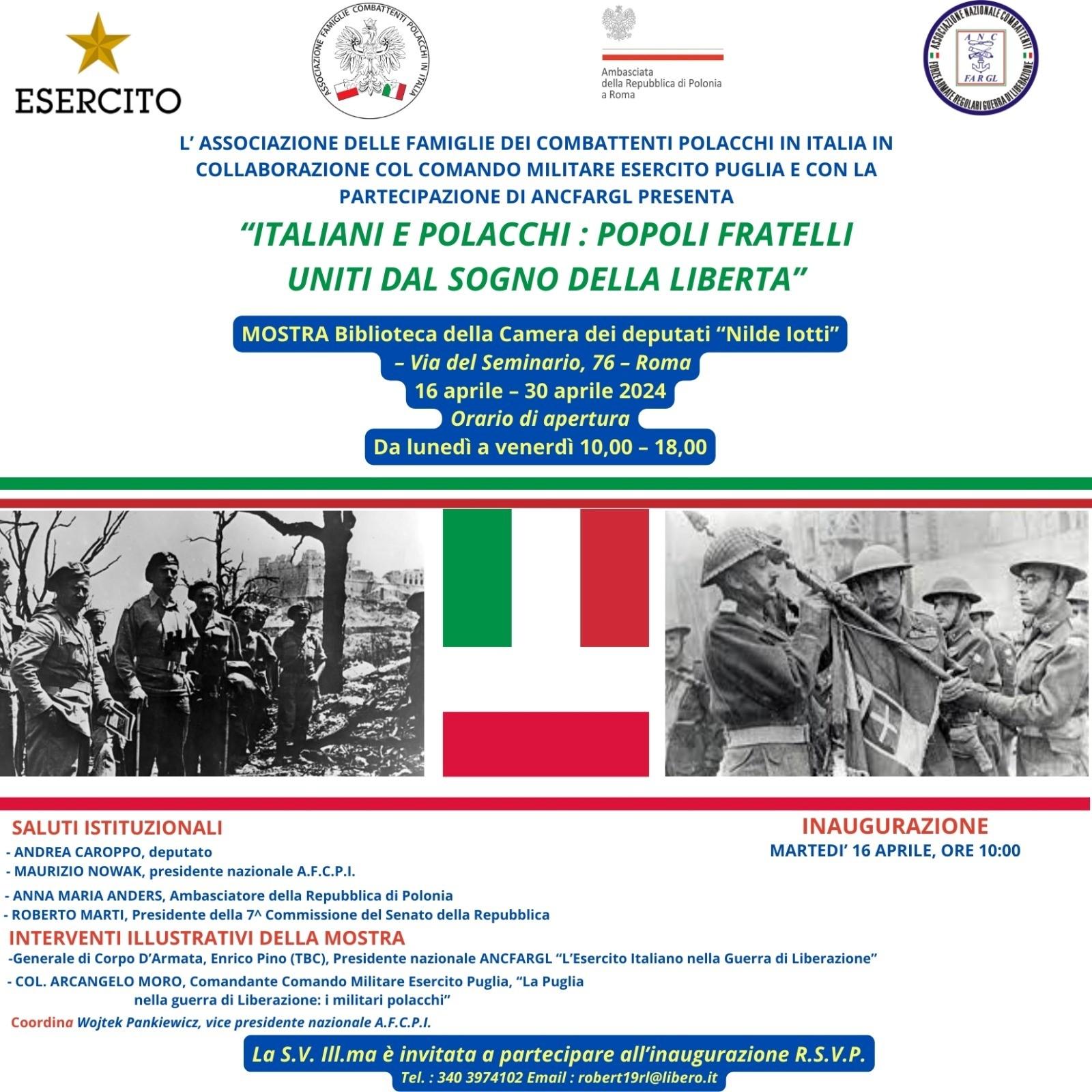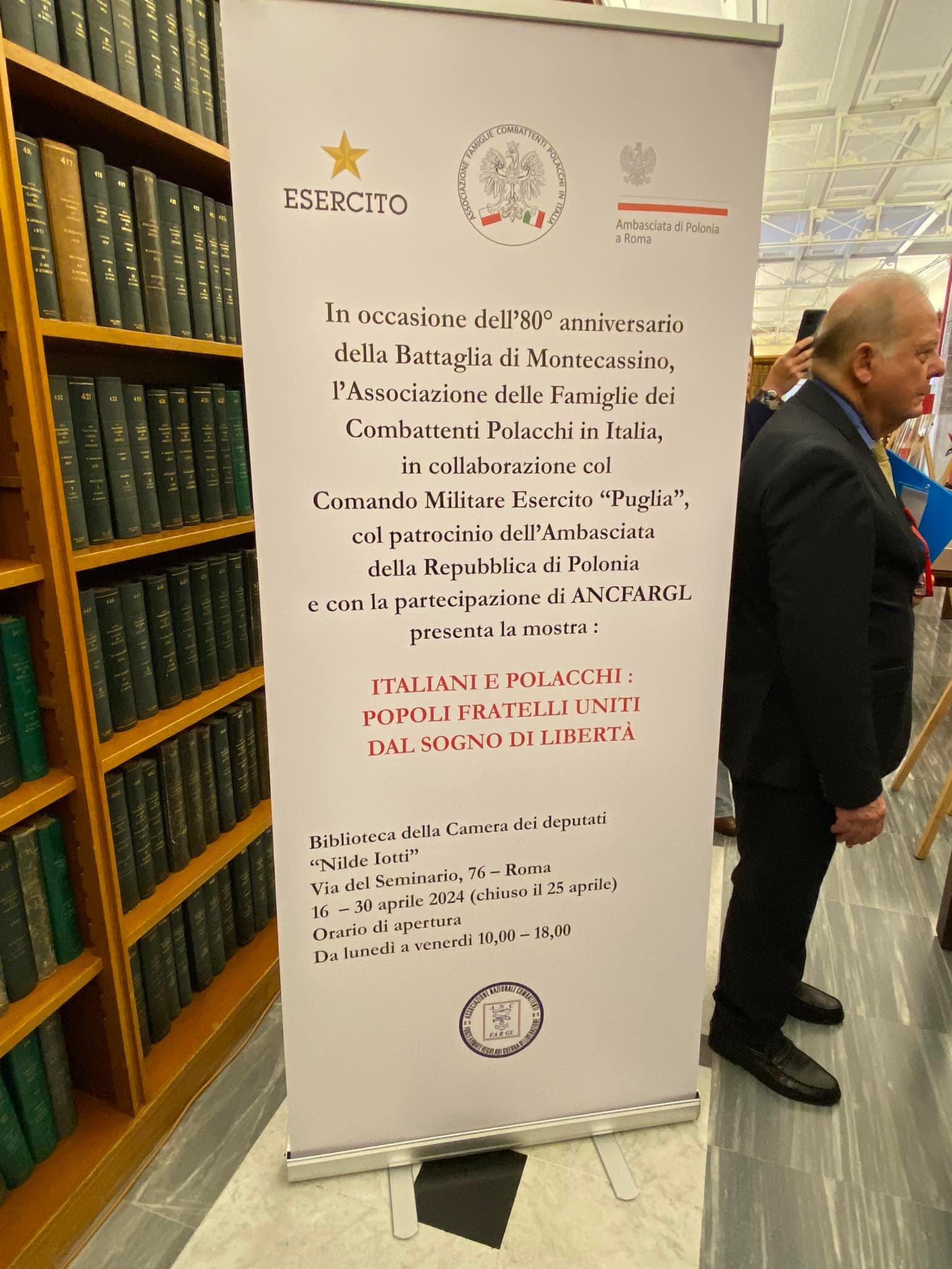 “Włosi i Polacy: braterskie narody zjednoczone marzeniem o wolności” – to tytuł wystawy zainaugurowanej przez ambasador Annę Marię Anders 16 kwietnia br. w bibliotece włoskiej Izby Deputowanych w Rzymie z okazji zbliżającej się 80. rocznicy bitwy o Monte Cassino.