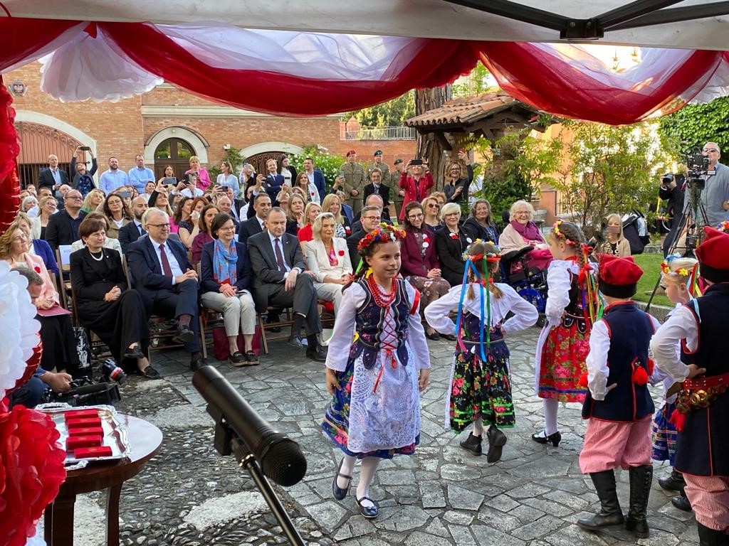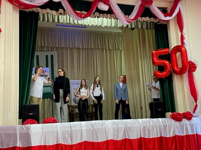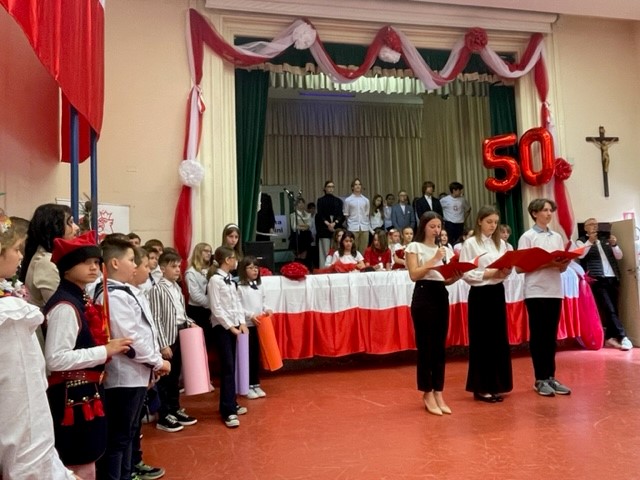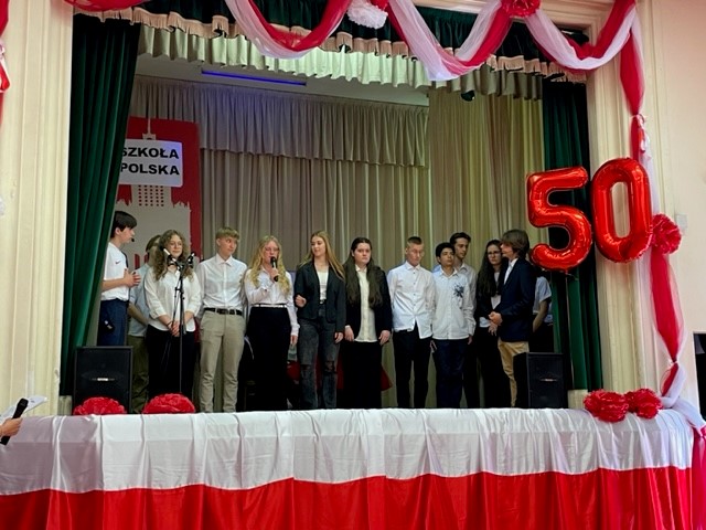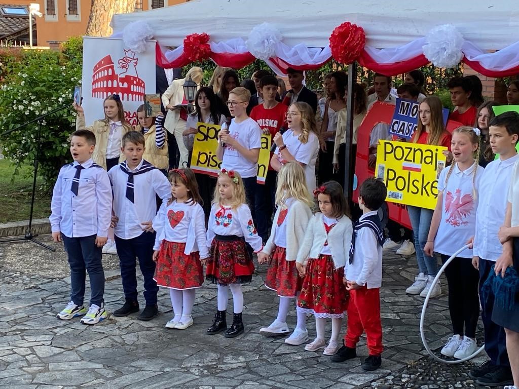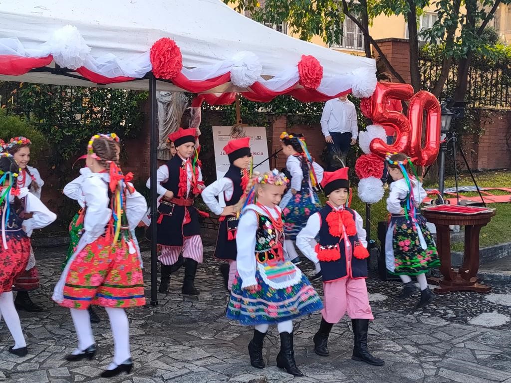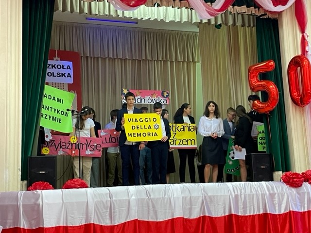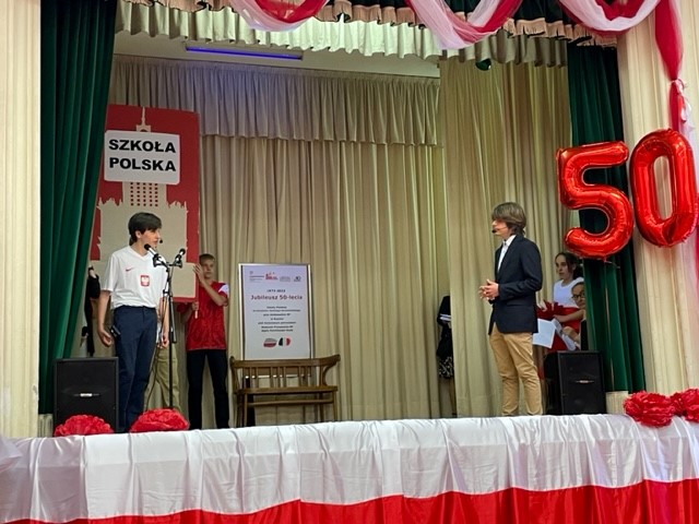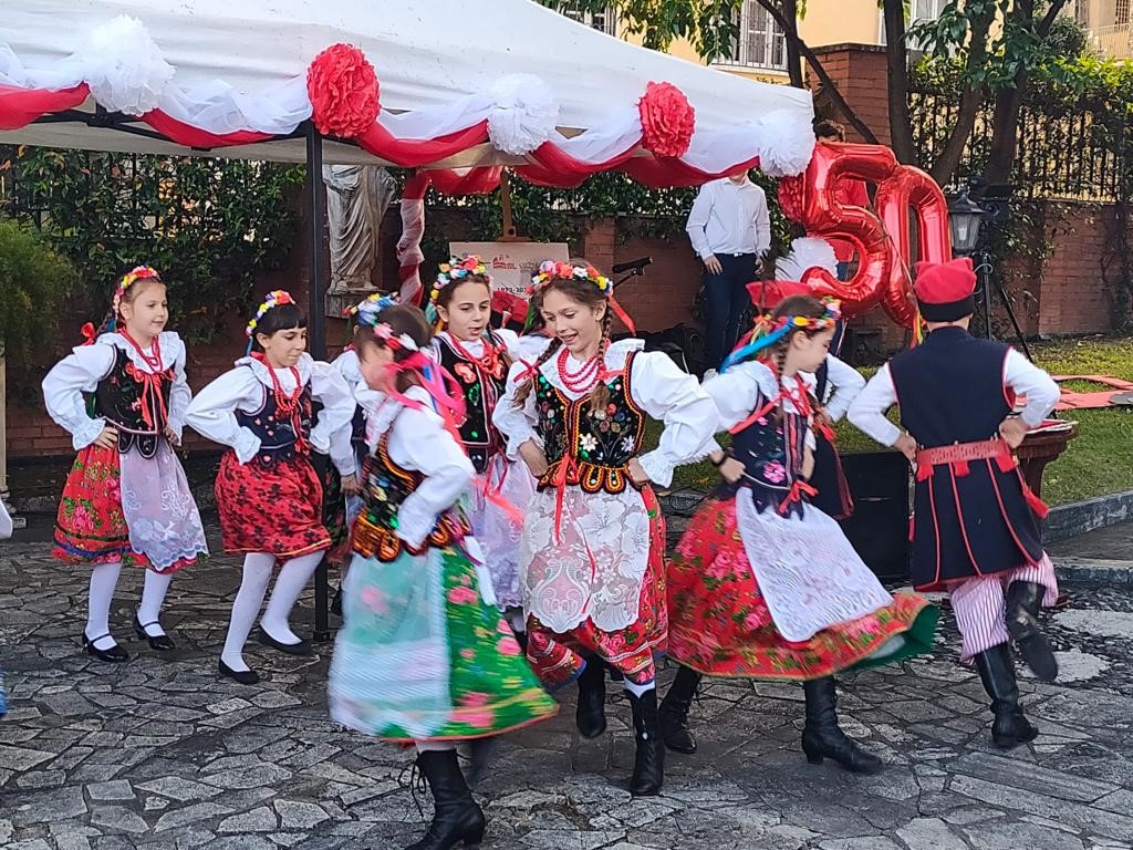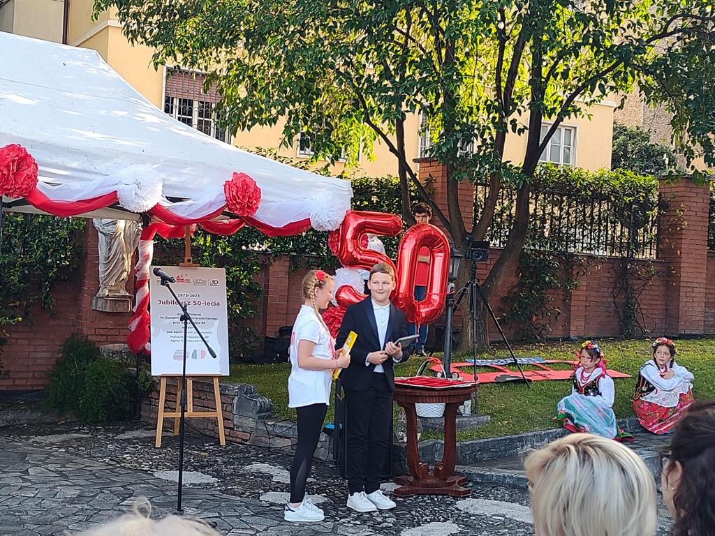 Na zaproszenie Ambasador Anny Marii Anders w piątkowe popołudnie uczniowie zaprezentowali w ogrodach Ambasady, specjalnie przygotowany na tę okazję autorski spektakl „50 lat minęło!”. Najmłodsi natomiast ucieszyli publiczność wiązanką tańców ludowych. Grono pedagogiczne, w uznaniu zasług dla oświaty i wychowania, zostało wyróżnione Medalami Komisji Edukacji Narodowej przyznanymi przez Ministra Edukacji i Nauki. Jubileusz obecnością swoją zaszczycili również Ambasador RP przy Stolicy Apostolskiej Adam Kwiatkowski, Senator Kazimierz Michał Ujazdowski, Przewodniczący Komisji Spraw Emigracji i Łączności z Polakami za Granicą, Senator Halina Bieda, Naczelnik w Departamencie Współpracy Międzynarodowej MEiN Małgorzata Żuk, Wicedyrektor Ośrodka Rozwoju Polskiej Edukacji za Granicą Barbara Talik, Rektor Kościoła Św. Stanisława w Rzymie ks. Paweł Ptasznik oraz przedstawiciele zaprzyjaźnionych szkół polonijnych.