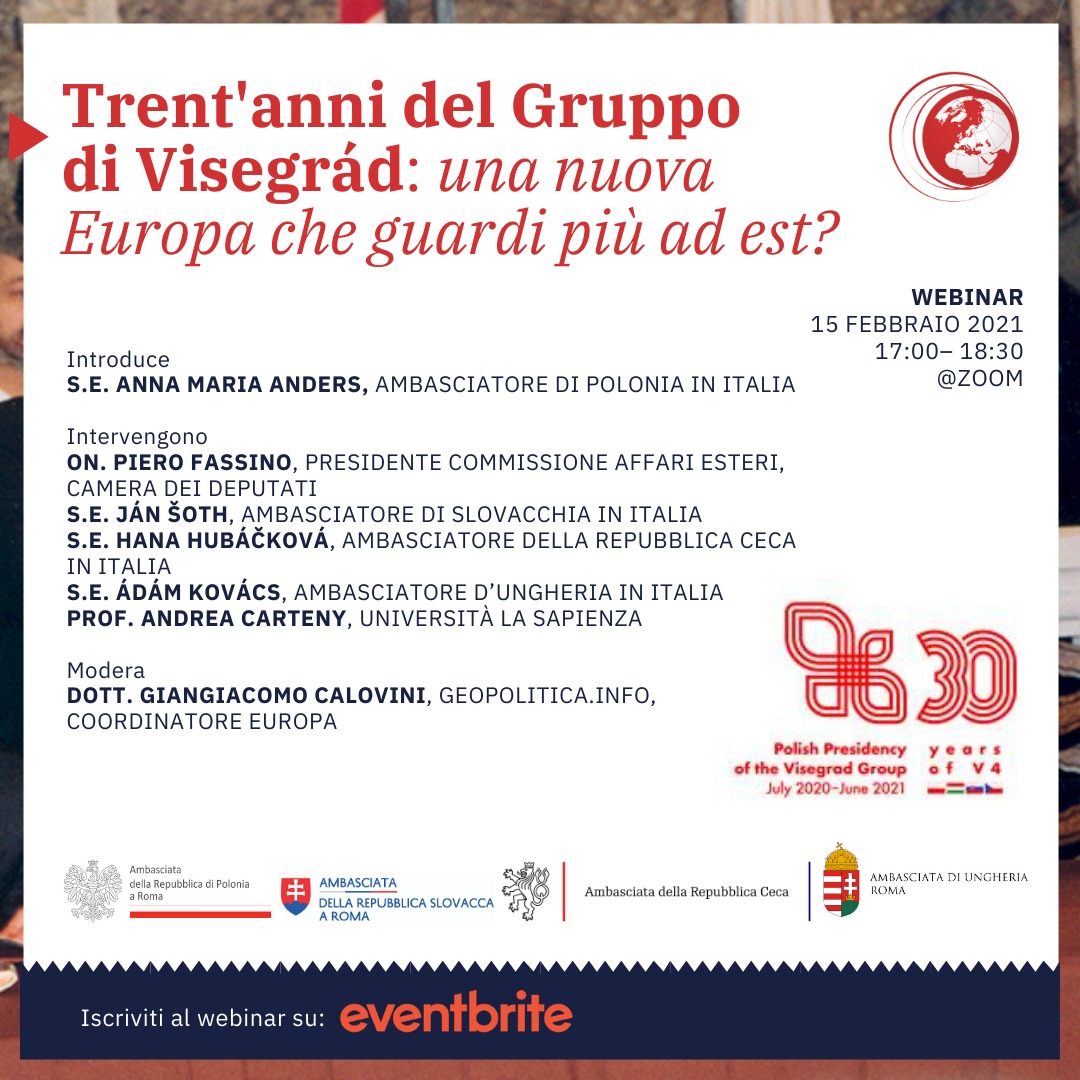 Zapraszamy na webinarium zorganizowane przez Ambasadę RP w Rzymie oraz włoskie Centrum Studiów Geopolitica z okazji 30-lecia powstania Grupy Wyszehradzkiej.