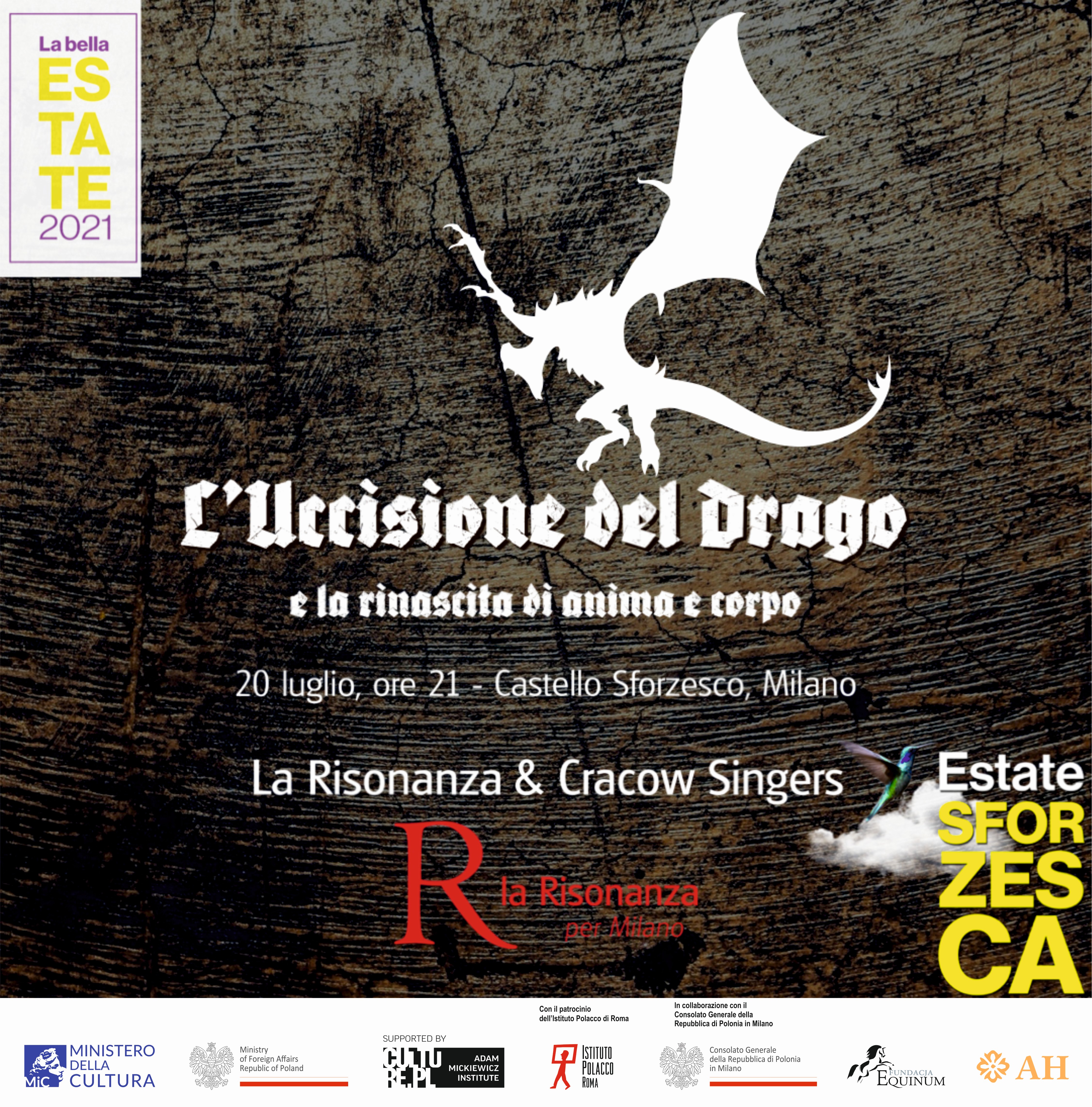 Z przyjemnością zapraszamy na niezwykłe wydarzenie koncertowe przygotowane przy współpracy naszego Konsulatu, w ramach Estate Sforzesca 2021: L'uccisione del drago e la rinascita di anima e corpo (Zabicie smoka i odrodzenie duszy i ciała).