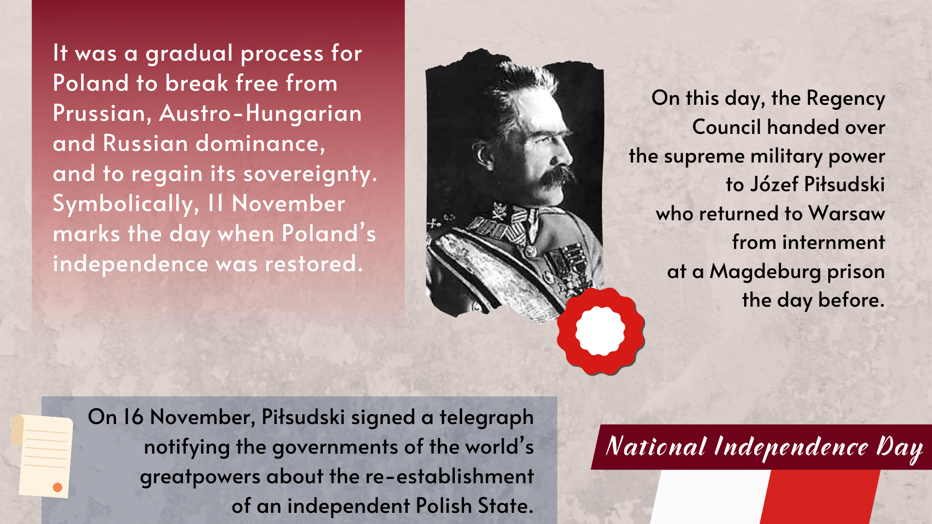 102 lata temu, 11 listopada 1918 r., Polska odzyskała niepodległość. Tego dnia uwolniony z twierdzy magdeburskiej Józef Piłsudski przejął z rąk Rady Regencyjnej władzę wojskową, po trzech dniach władzę cywilną, by wreszcie „jako Wódz Naczelny Armii Polskiej […] notyfikować rządom i narodom wojującym i neutralnym” powrót „Polskiej Rzeczypospolitej Odrodzonej i Niepodległej” na mapę świata. Po 123 latach Polska stawała się suwerennym państwem, odzyskując podmiotowość na arenie międzynarodowej.