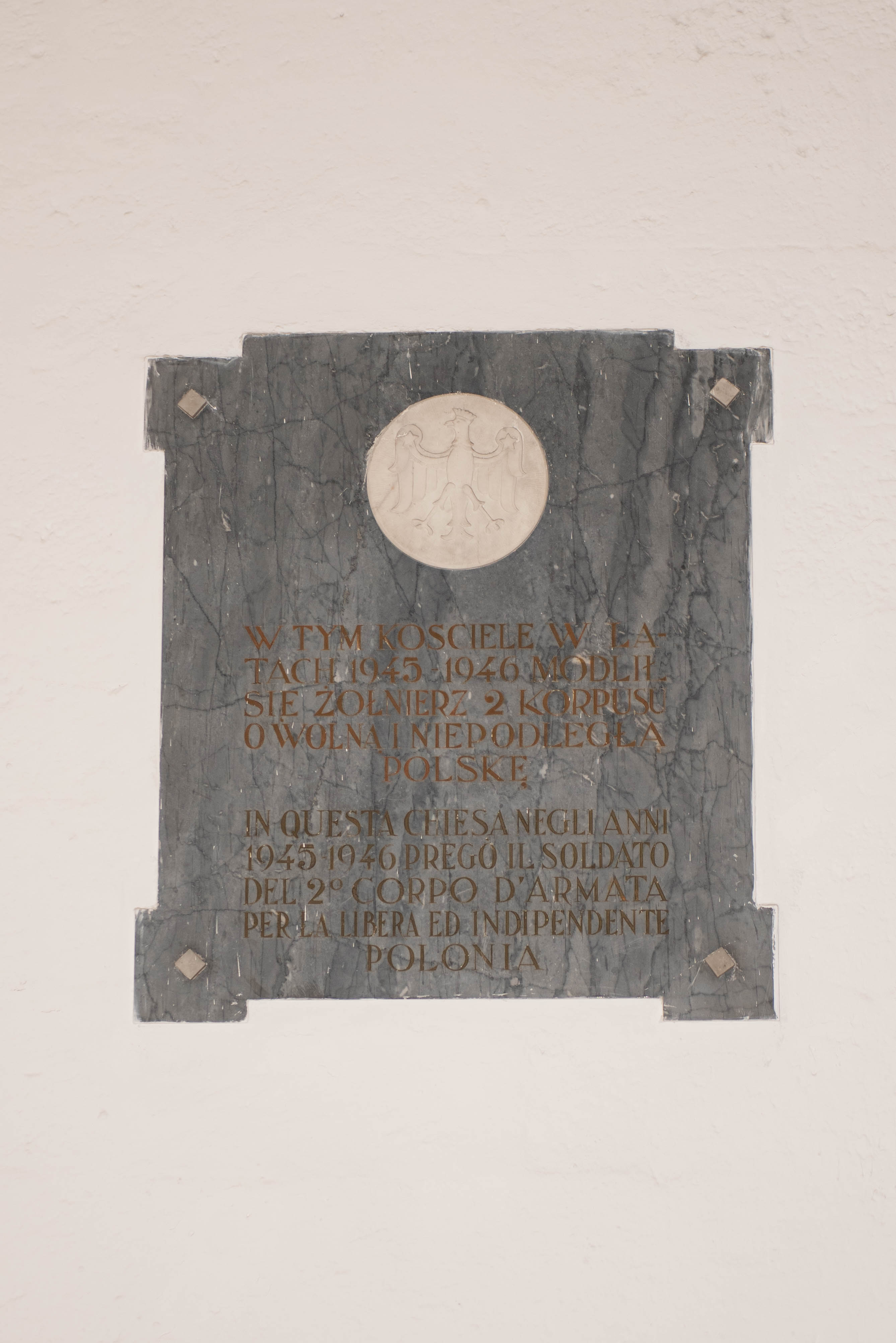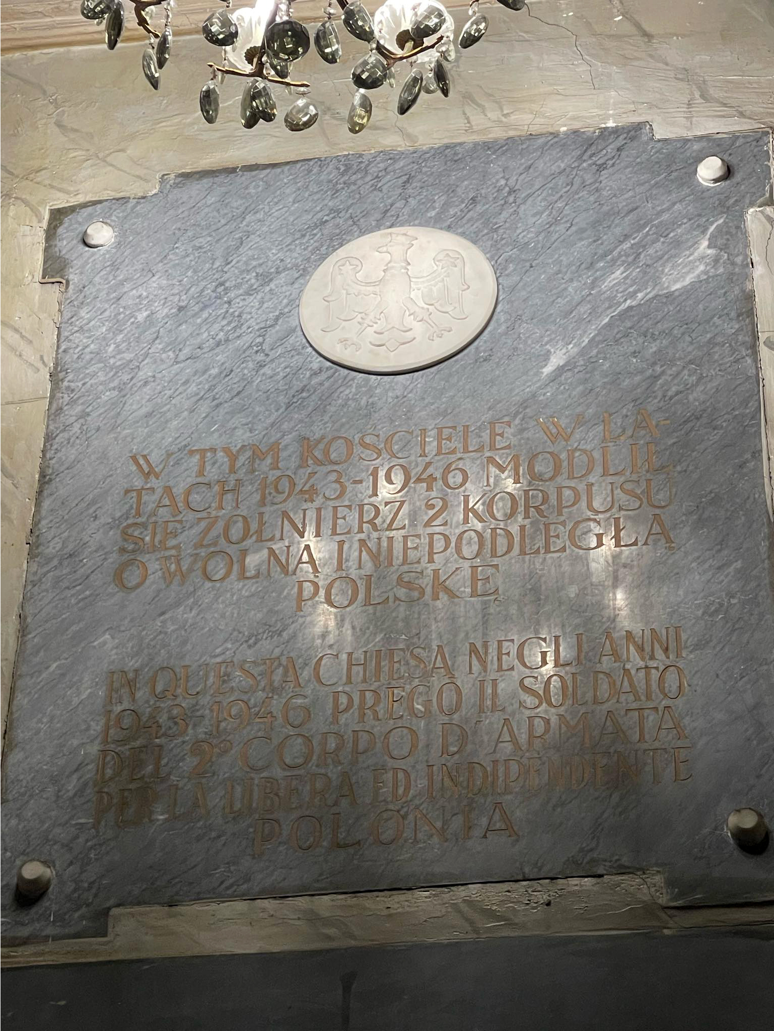 Napis: W tym kościele w latach 1943-1946 modlili się żołnierze 2 korpusu o wolna i niepodległą Polskę.