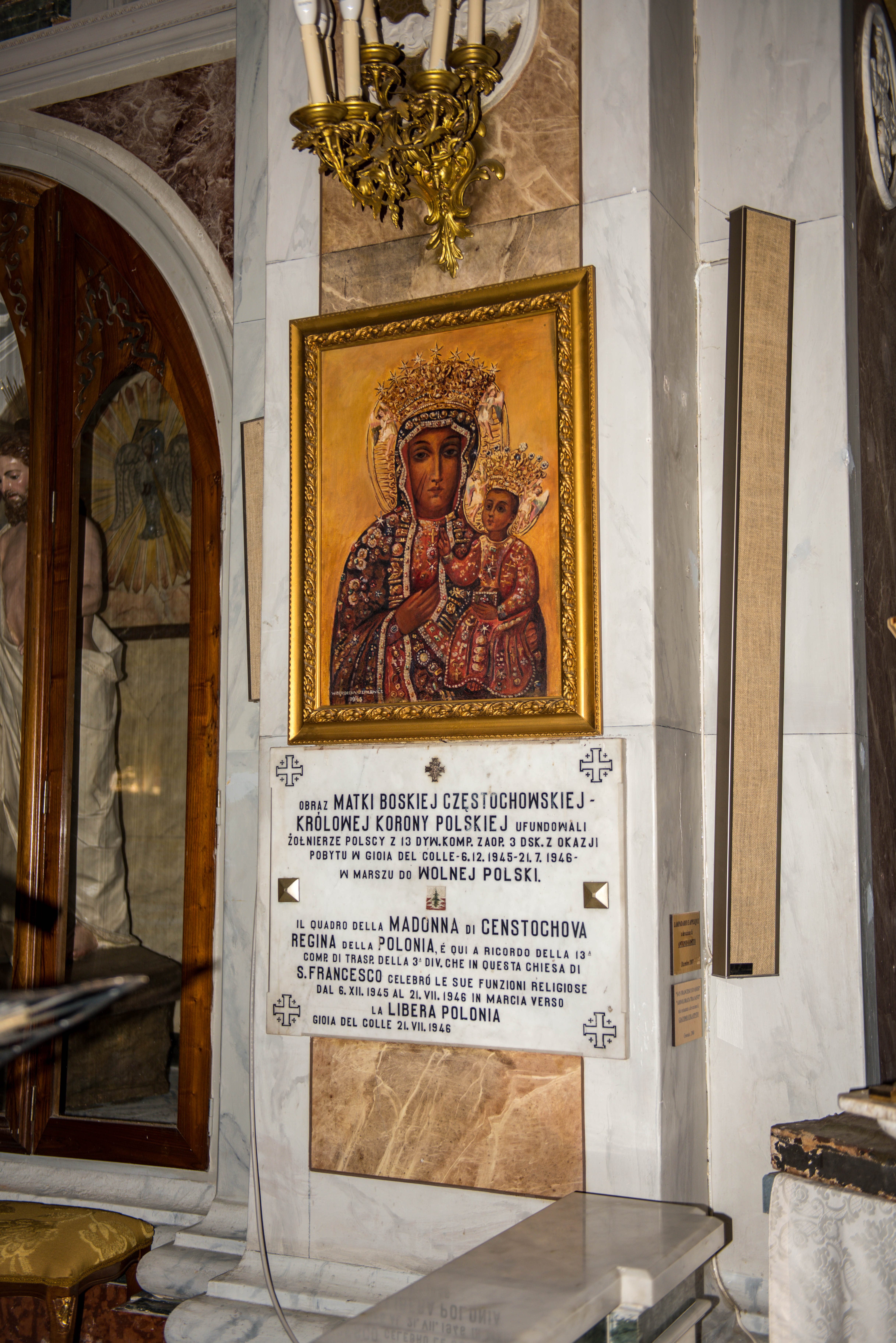 Na marmurowej tablicy pod obrazem można przeczytać: Obraz Matki Boskiej Częstochowskiej -Królowej Korony Polskiej ufundowali żołnierze polscy z 13 Dyw. Kom. Zaop. 3 DSK. Z okazji pobytu w Gioia del Colle – 6.12.1945 - 21.7.1946 w marszu do wolnej Polski