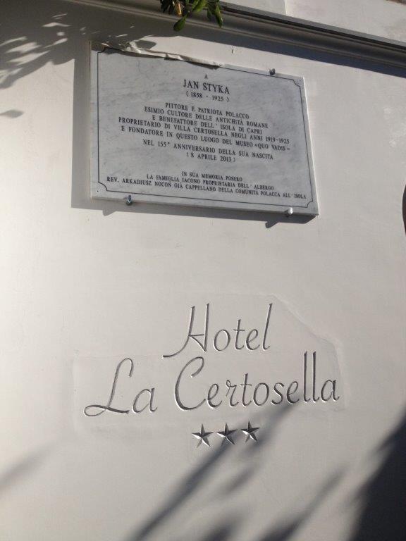 Tablica upamiętniająca Jana Stykę na Capri została zainstalowana przy wejściu do willi La Certosella, której artysta był właścicielem od 1919 r. i w którym stworzył Muzeum Quo vadis (1920-1931), będące jednym z ważniejszych ośrodków kultury polskiej na ziemi włoskiej w pierwszej połowie XX wieku i prawdopodobnie pierwszym muzeum sztuki na wyspie.