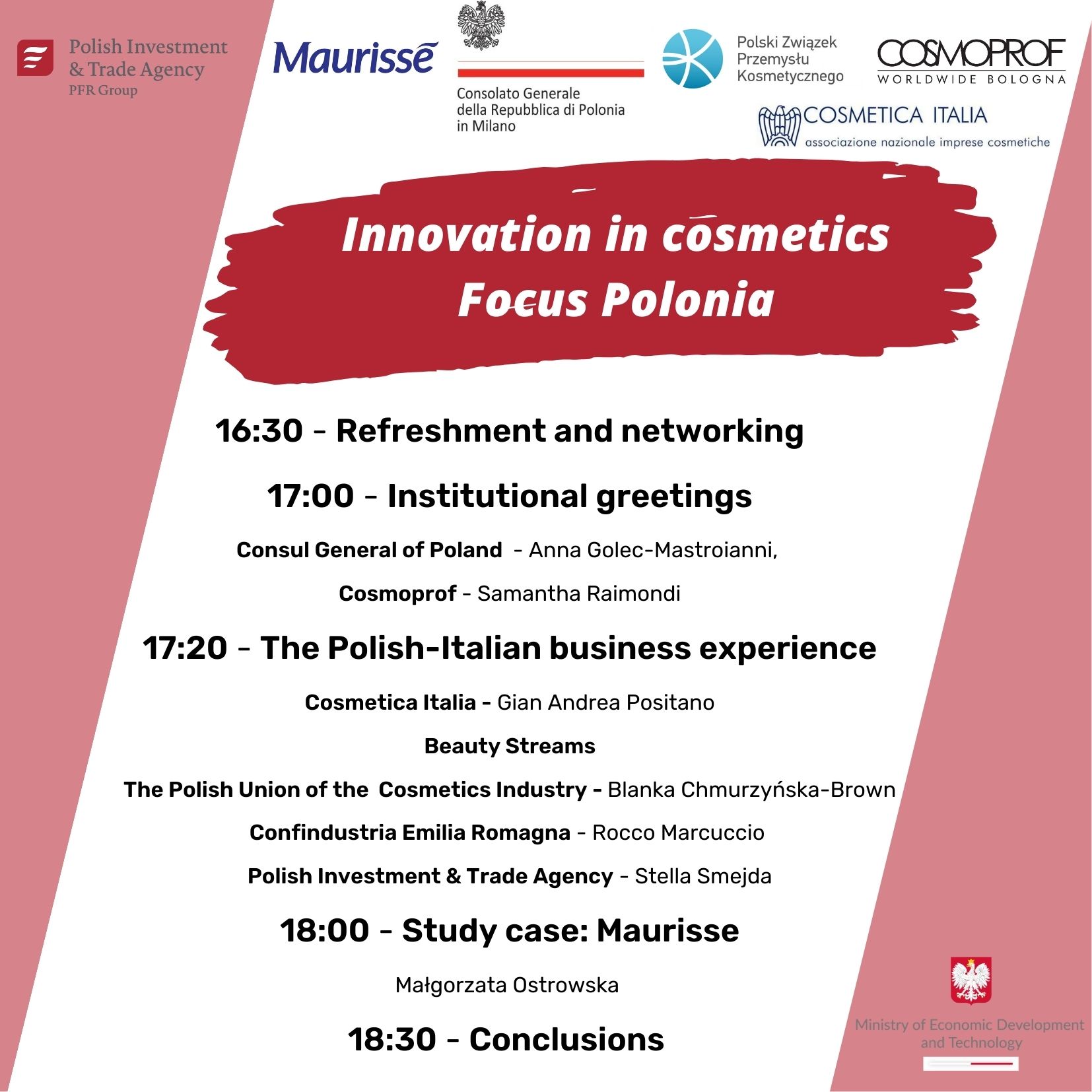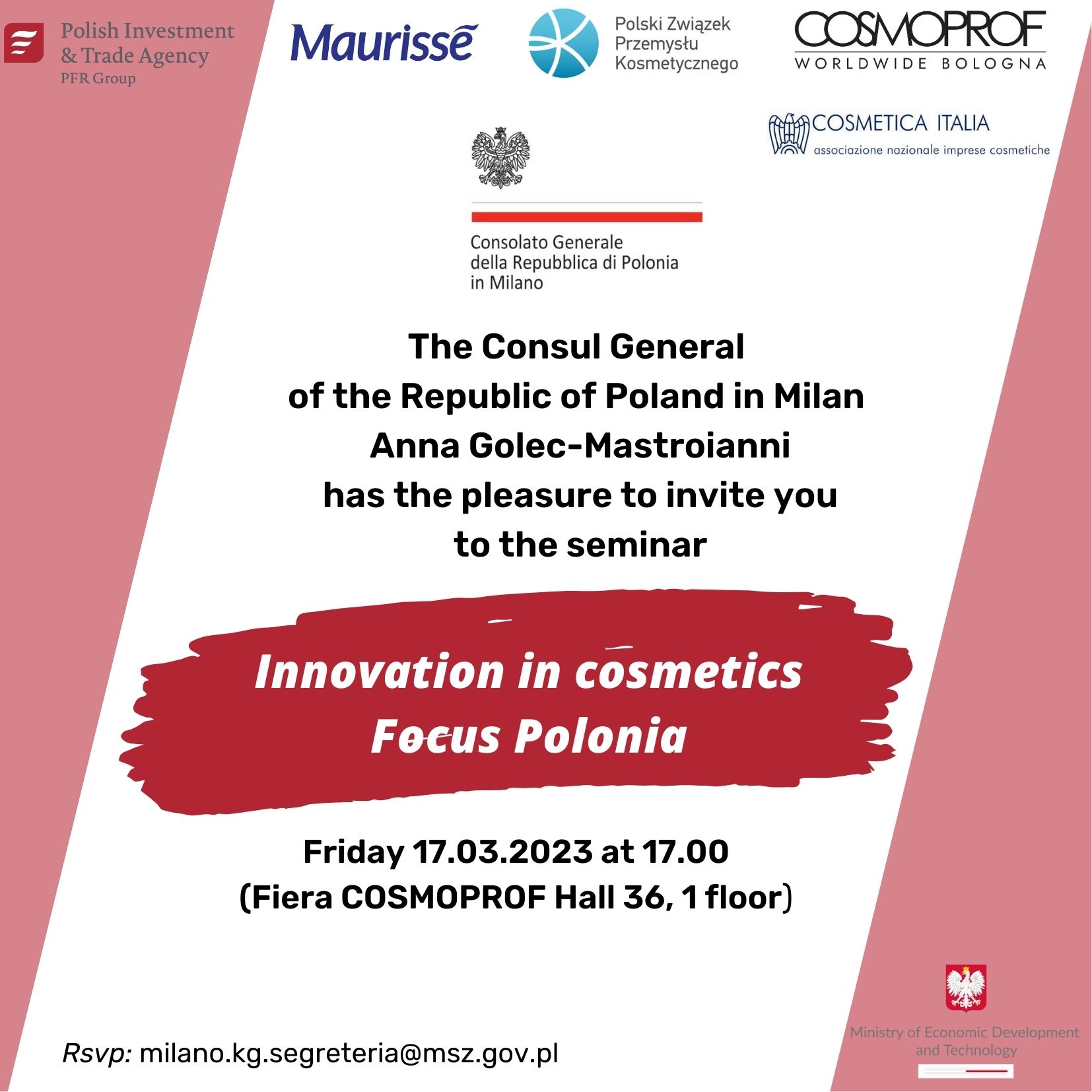 W ramach targów COSMOPROF BOLONIA 2023, Konsulat Generalny RP organizuje seminarium poświęcone innowacyjności w kosmetyce, a w szczególności polskiej innowacyjności w branży kosmetycznej - 17 marca 2023 r. godz. 17.00 na Cosmoprof Bolonia Hall 36, 1 piętro.