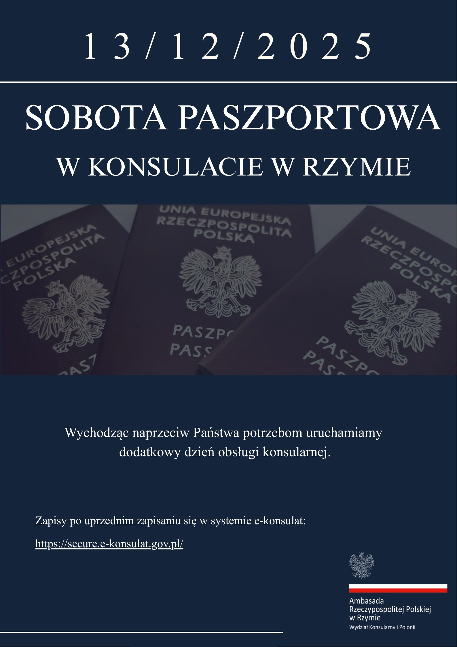 Wychodząc naprzeciw potrzebom polskich obywateli, Konsul RP w Rzymie zaprasza do zapisów na kolejny już dodatkowy dyżur paszportowy, który odbędzie się w sobotę 13 grudnia 2025 r. Tego dnia możliwe będzie złożenie wniosku o wydanie polskiego paszportu po uprzednim zapisaniu się w systemie e-konsulat: https://secure.e-konsulat.gov.pl/