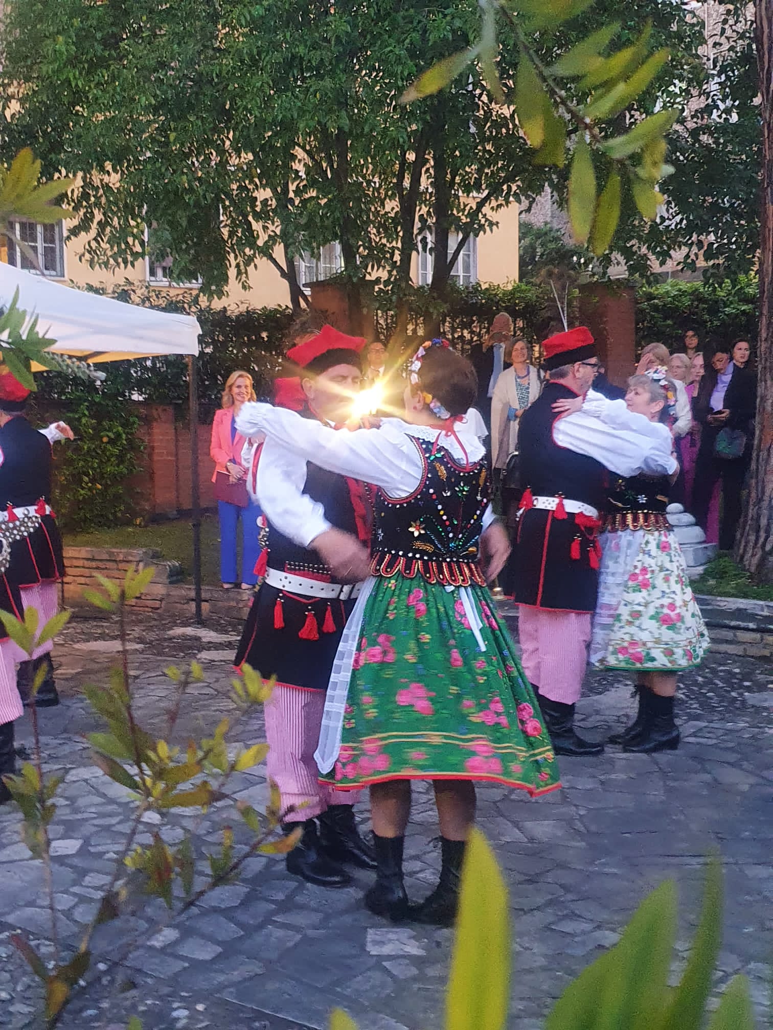 Patriotycznym akcentem podczas uroczystości był także występ tancerzy amatorskiego zespołu tańca „Czerwone Maki", utworzonego przez członków włoskiej Polonii, którzy w tradycyjnych krakowskich strojach wykonali polskie tańce narodowe: Poloneza, Oberka, Kujawiaka i Krakowiaka. Część oficjalna uroczystości zakończyła się prezentacją promocyjną w obecności wiceprezesa „Polskich Portów Lotniczych" Pawła Siennickiego nowych połączeń lotniczych miedzy lotniskiem Warszawa-Radom a portem Rzym-Fiumicino oraz zaproszeniem gości do odwiedzenia naszego kraju.