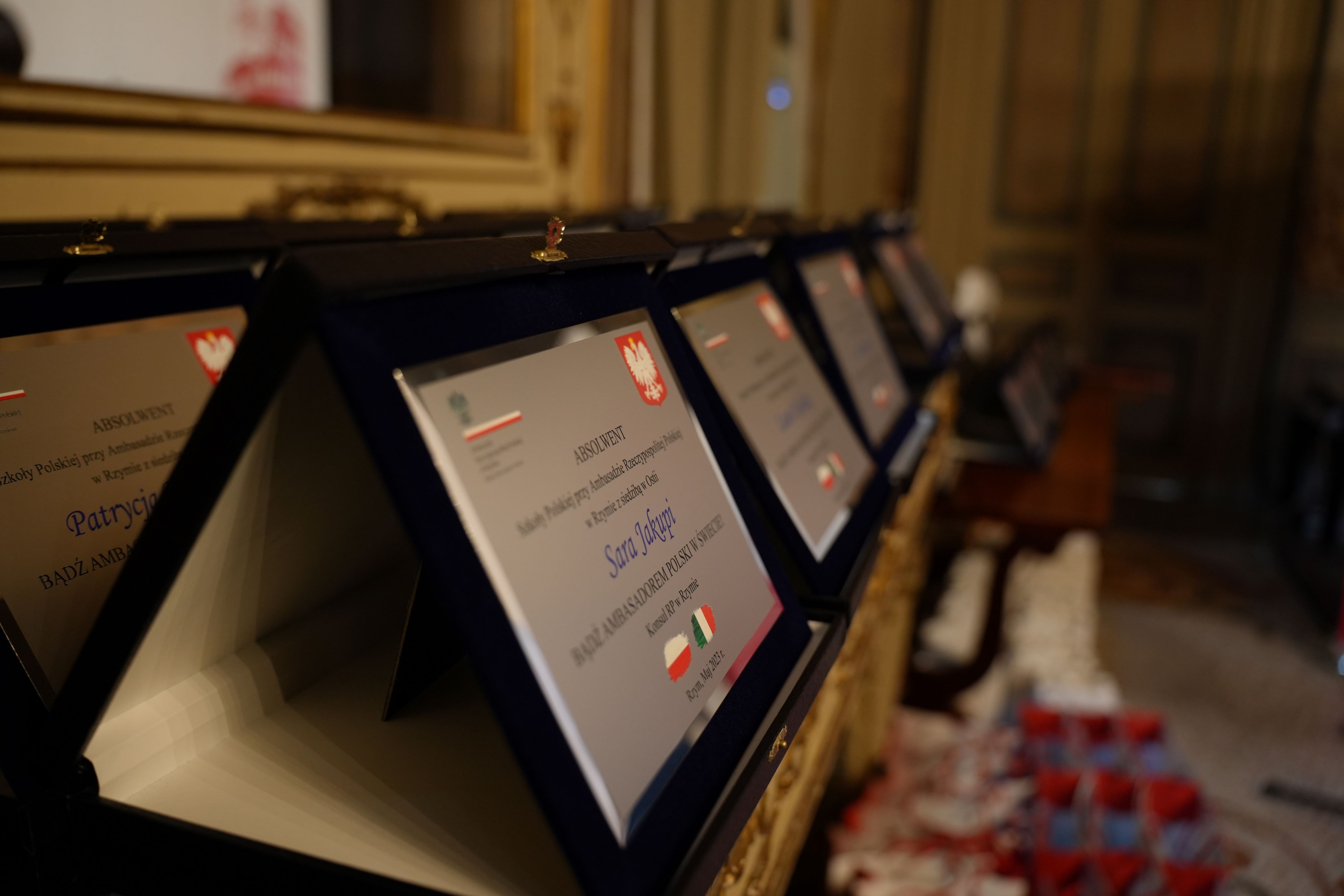 Zakończenie roku szkolnego dla najstarszych uczniów Szkoły Polskiej jest zawsze okazją do wielu wspomnień i wzruszeń. Tak też było i tym razem – panie dyrektor szkół z Rzymu i Ostii, Danuta Stryjak i Marta Czajczyńska oraz prowadzące klasy maturalne wychowawczynie z dumą wręczały absolwentom tabliczki „Jesteś Ambasadorem polskości”, ufundowane ze środków polonijnych MSZ. W czasie okolicznościowych przemówień padały słowa uznania skierowane zarówno do uczniów za ich wytrwałość w uczęszczaniu do szkoły jak i również ich rodziców, którzy włożyli wiele trudu, by wychowywać swoje dzieci w dwukulturowości i dwujęzyczności. Minister Przemysław Czarnek zwracając się do obecnych w czasie uroczystości, zapowiedział wprowadzenie zmian legislacyjnych, które umożliwią absolwentom polskich szkół za granicą uzyskanie certyfikatów znajomości języka polskiego. Informacja ta spotkała się z bardzo dużym entuzjazmem młodej Polonii i ich rodzin.