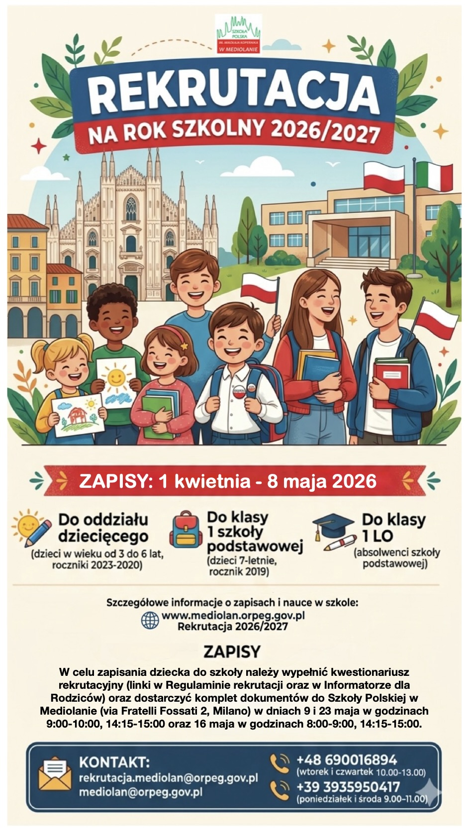 Zapisy do Szkoły Polskiej im. Mikołaja Kopernika w Mediolanie na rok szkolny 2026-2027