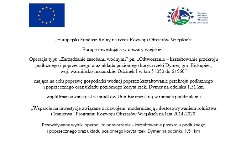W dniu 26.04.2024 r. podpisano umowę o przyznanie pomocy z Samorządem Województwa Warmińsko-Mazurskiego w Olsztynie na realizacją operacji typu „Zarządzanie zasobami wodnymi” pn. „Odtworzenie - kształtowanie przekroju podłużnego i poprzecznego oraz układu poziomego koryta rzeki Dymer, gm. Biskupiec, woj. warmińsko-mazurskie. Odcinek I w km 5+050 do 6+560” współfinansowaną ze środków Unii Europejskiej w ramach poddziałania „Wsparcie na inwestycje związane z rozwojem, modernizacją i dostosowywaniem rolnictwa i leśnictwa” Programu Rozwoju Obszarów Wiejskich na lata 2014–2020.