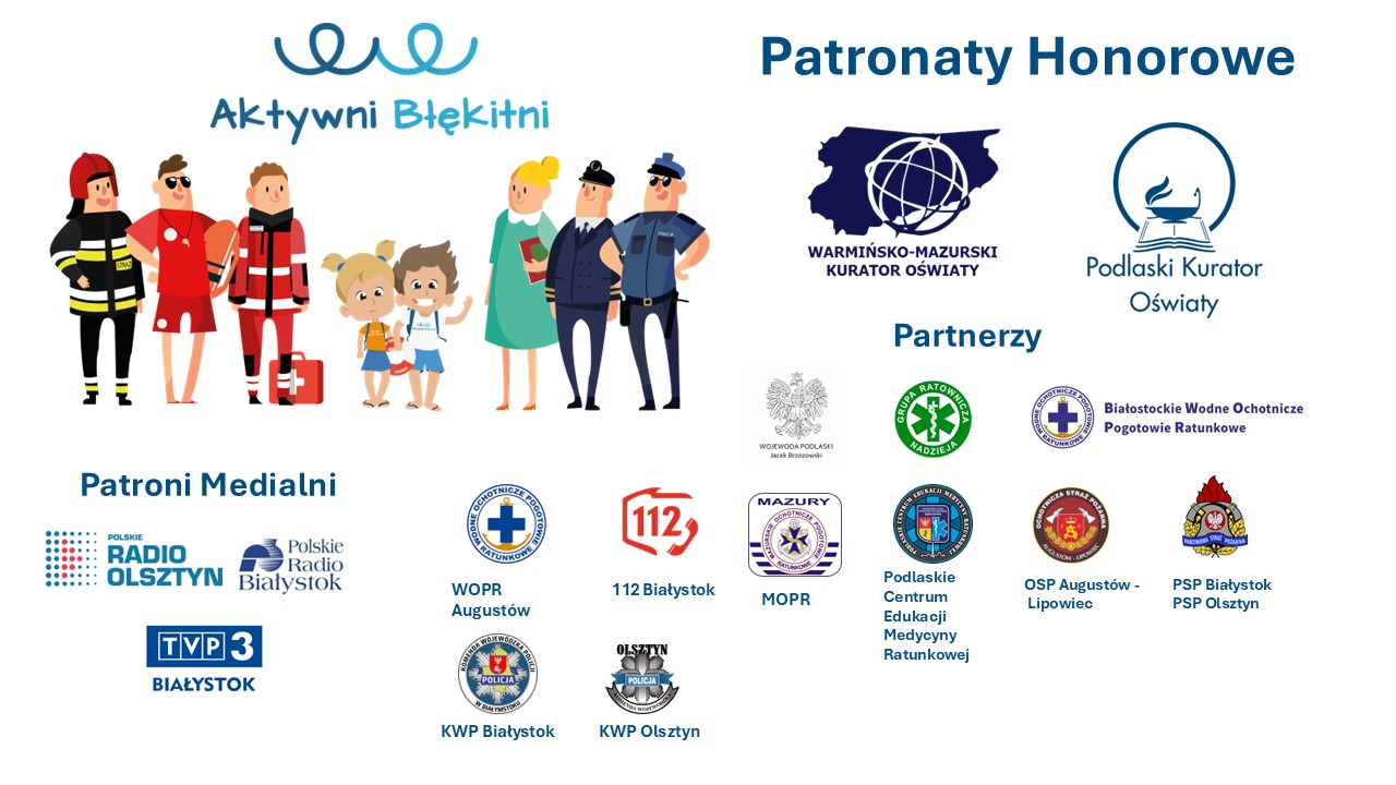 Natomiast przy realizacji tegorocznej edycji programu wspierać nas będą następujący partnerzy: Wojewoda Podlaski, Grupa Ratownicza Nadzieja, WOPR Białystok, WOPR Augustów, 112 Białystok, MOPR, Podlaskie Centrum Edukacji Medycyny Ratunkowej, OSP Augustów – Lipowiec, PSP Białystok, PSP Olsztyn, KWP Białystok, KWP Olsztyn.