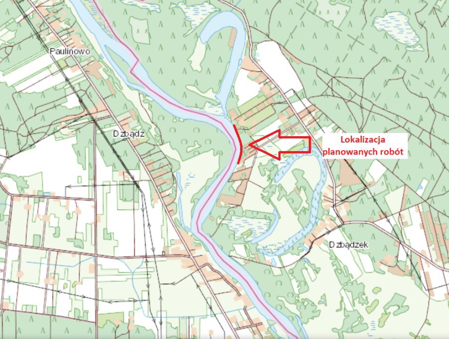 Państwowe Gospodarstwo Wodne Wody Polskie podejmuje kolejne działania na rzecz ochrony mieszkańców i infrastruktury zagrożonej postępującą erozją brzegów rzeki Narew. Na odcinku km 112+600 - 112+800 w miejscowości Dzbądzek, gmina Goworowo, powiat ostrołęcki, przygotowano inwestycję, której celem jest skuteczne ograniczenie procesów niszczących skarpę oraz zabezpieczenie pobliskich nieruchomości.