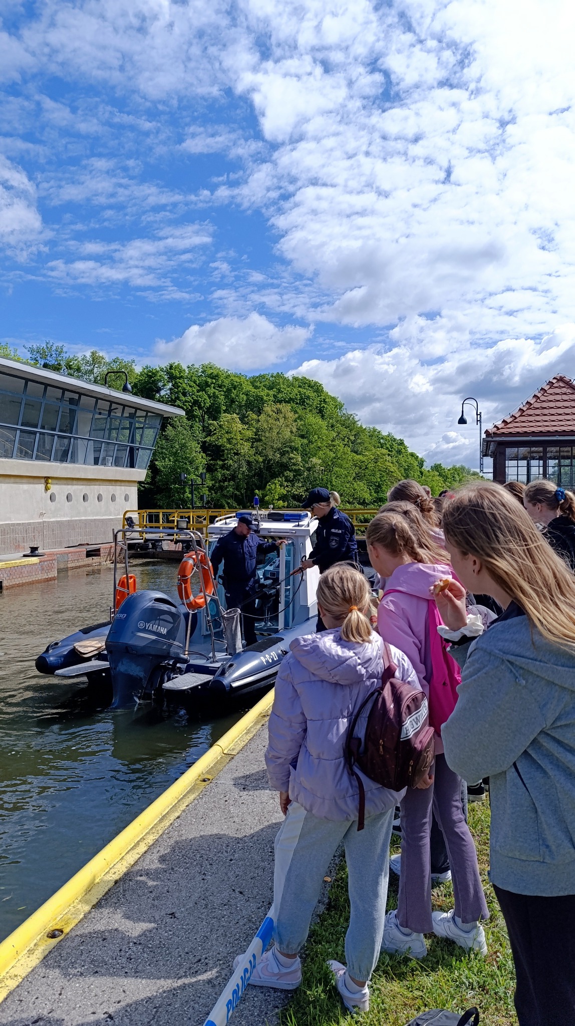 Pani Aspirant Zofia Wrzeszcz z Komendy Wojewódzkiej Policji w Bydgoszczy, która towarzyszyła dzieciom w czasie wydarzenia, opowiadała o zasadach bezpiecznego spędzania czasu nad wodą w kontekście zbliżających się wakacji. Dzieci miały również okazję zobaczyć policyjną motorówkę, która – ku ogromnej radości uczestników – została śluzowana w obecności dzieci i dokładnie omówiona przez funkcjonariuszy. Nieocenioną rolę w wydarzeniu odegrali również pracownicy Śluzy Okole, którzy z pasją i zaangażowaniem przedstawiali działanie mechanizmów śluzowych, oraz opowiadali o jej roli jaką pełni w regionie.