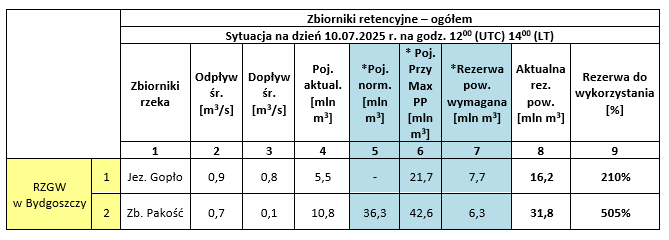 w okresie od godz. 6:00 10 lipca 2025 r., do godz. 14:00 czasu lokalnego 10 lipca 2025 r. w regionie wodnym Noteci nie odnotowano zdarzeń o charakterze hydrologicznym,