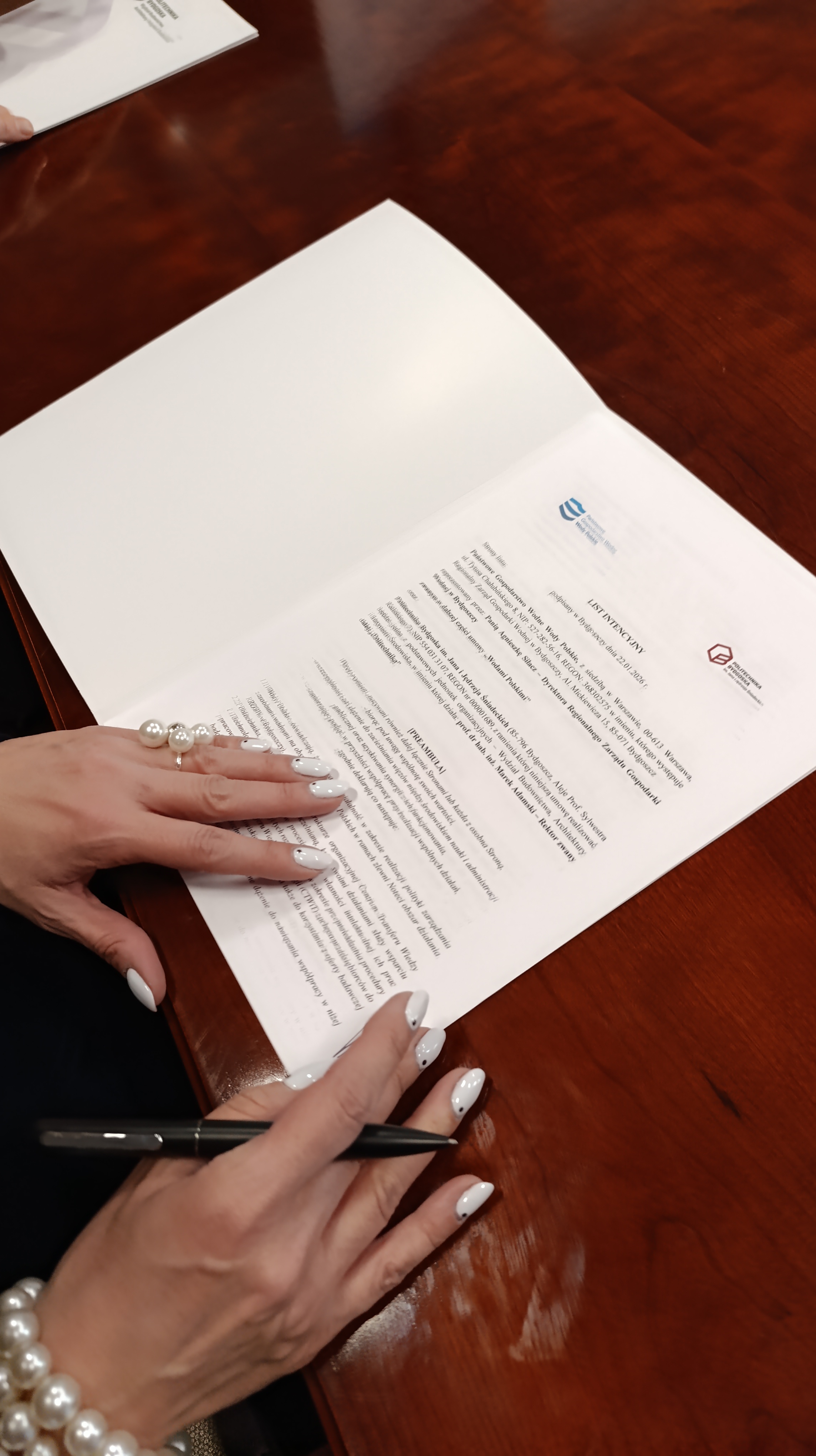 Ze strony Wód Polskich porozumienie sygnowała Agnieszka Siłacz - dyrektor RZGW w Bydgoszczy, ze strony Politechniki Bydgoskiej prof. dr hab. inż. Marek Adamski - JM Rektor Politechniki Bydgoskiej.