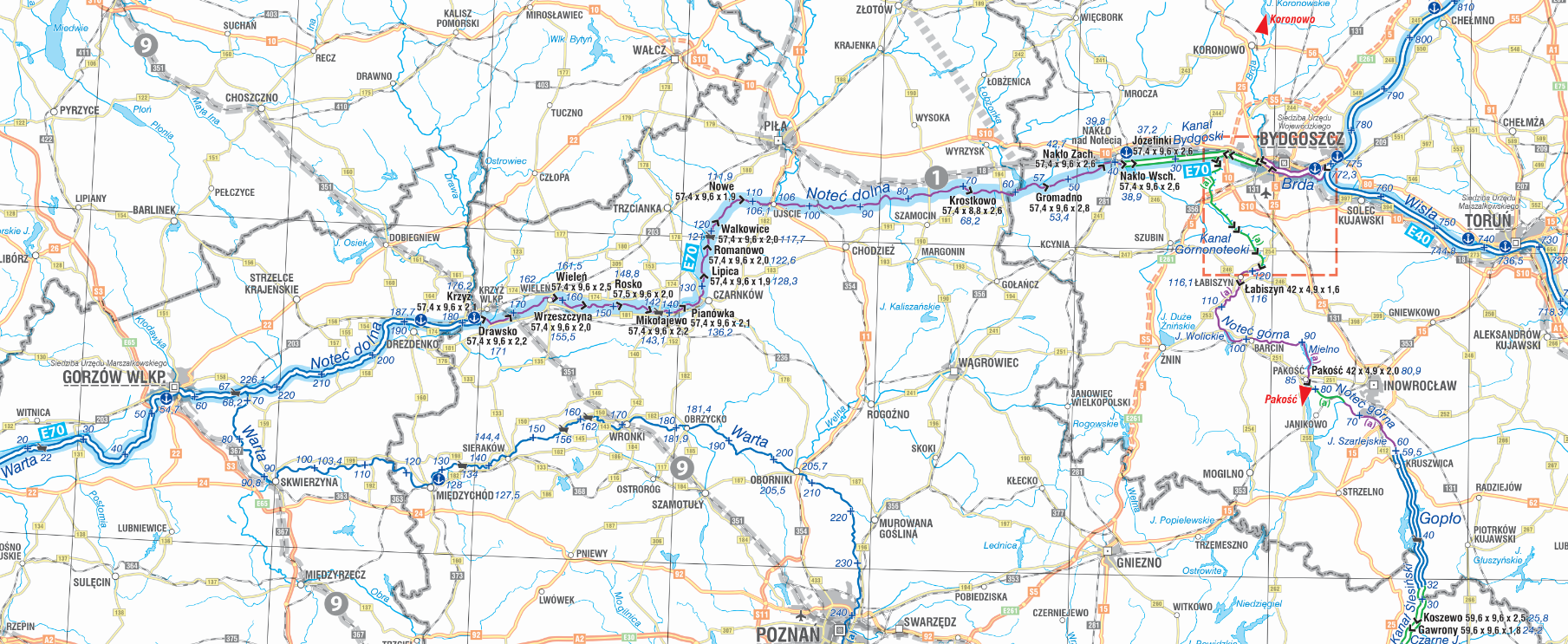 rzeka Noteć od jeziora Gopło do połączenia z Kanałem Górnonoteckim wraz z tym kanałem i jeziorami na jej trasie oraz od połączenia z Kanałem Bydgoskim do ujścia do rzeki Warty.