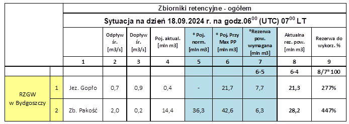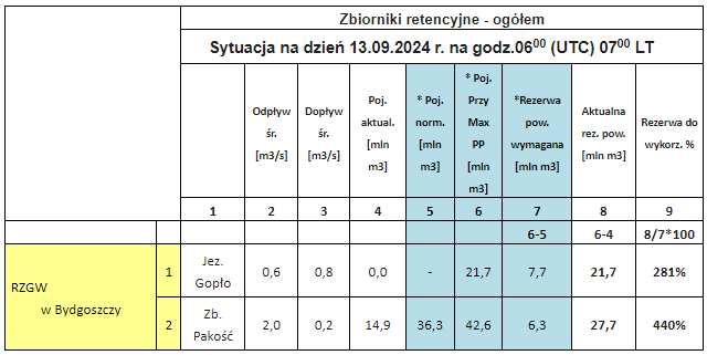 Główne zbiorniki wielozadaniowe retencyjne Gopło oraz Pakość posiadają pełną rezerwę powodziową.