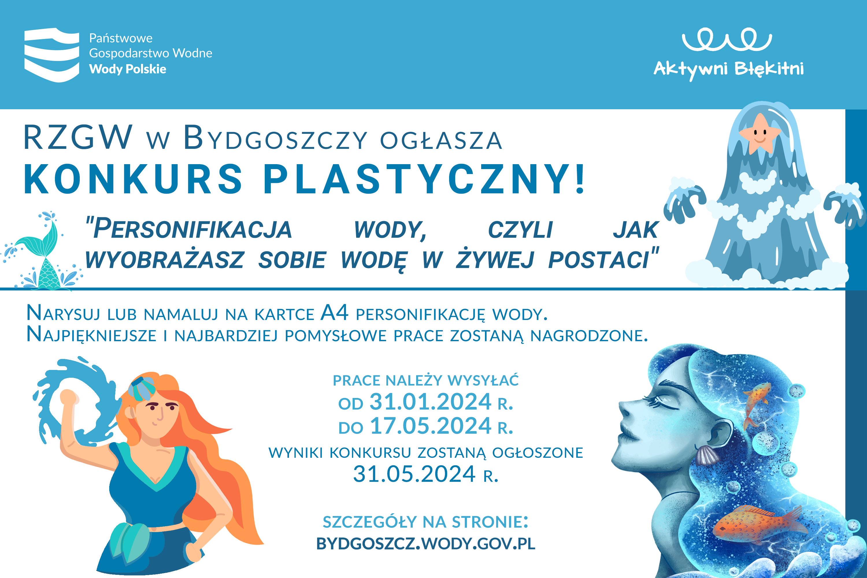 Zapraszamy serdecznie uczniów zrzeszonych w programie Aktywni Błękitni do wzięcia udziału w konkursie! Konkurs plastyczny pn. „Personifikacja wody, czyli jak wyobrażasz sobie wodę w żywej postaci” startuje dzisiaj. Na Wasze prace czekamy do 17 maja 2024 r. Ogłoszenie wyników - 31 maja 2024 r.
