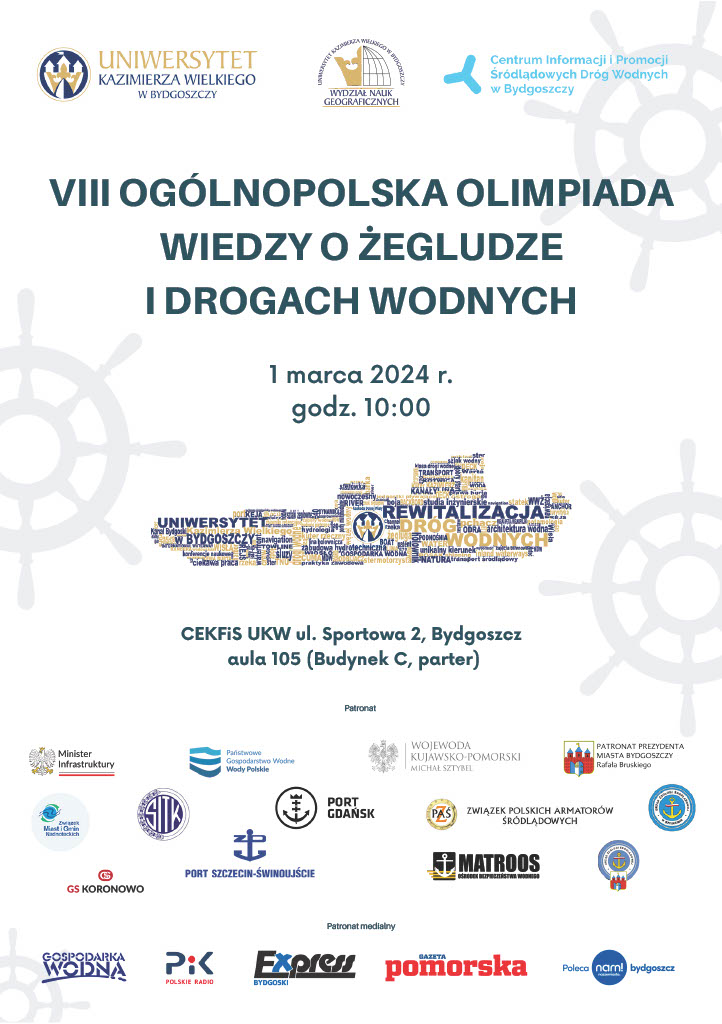 Organizatorami konkursu są: Katedra Rewitalizacji Dróg Wodnych, Wydział Nauk Geograficznych Uniwersytetu Kazimierza Wielkiego w Bydgoszczy oraz Centrum Informacji i Promocji Śródlądowych Dróg Wodnych w Bydgoszczy. To właśnie na UKW realizowany jest jedyny w skali kraju kierunek – Rewitalizacja Dróg Wodnych. Szczegóły olimpiady na plakacie poniżej.
