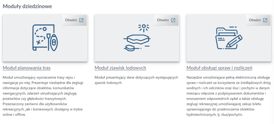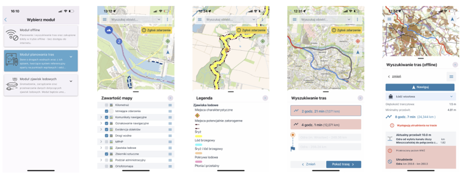 - Dla turystów: umożliwia opłacenie śluzowań, wyszukiwanie tras oraz zgłaszanie zauważonych na drogach wodnych przeszkód.