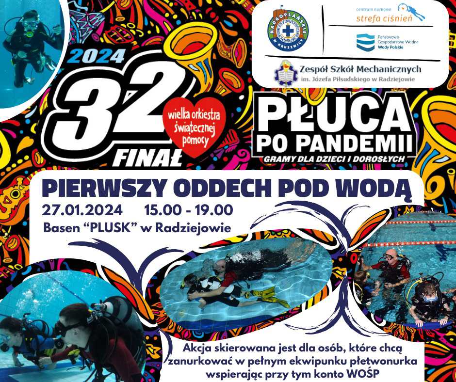 W ramach 32 Finału Wielkiej Orkiestry Świątecznej Pomocy 27 stycznia 2024 r. w godzinach od 15.00 do 19.00 na Pływalni Plusk w Radziejowie wspólnie z Zespołem Szkół Mechanicznych w Radziejowie, Centrum Nurkowym Strefa Ciśnień i naszym Partnerem Programu Edukacyjnego Aktywni Błękitni – Nadgoplański WOPR Kruszwica partnerujemy akcji pn. "PIERWSZY ODDECH POD WODĄ".