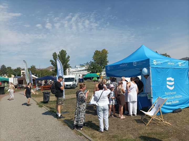 Pracowników Wód Polskich można było spotkać również na lądzie, gdzie przy naszym stoisku chętnie dzielili się wiedzą, materiałami informacyjnymi oraz naszymi gadżetami z uczestnikami Festiwalu.
