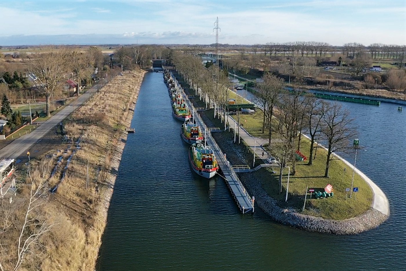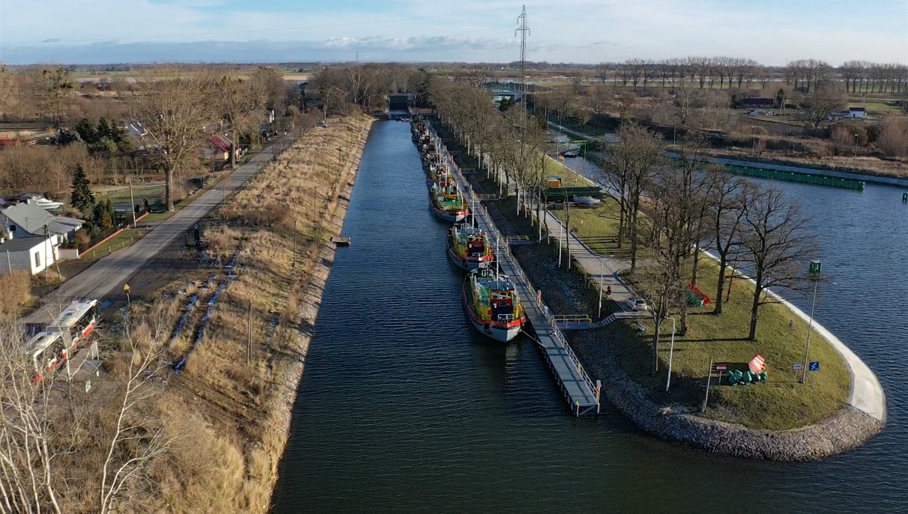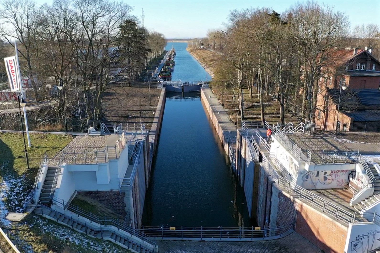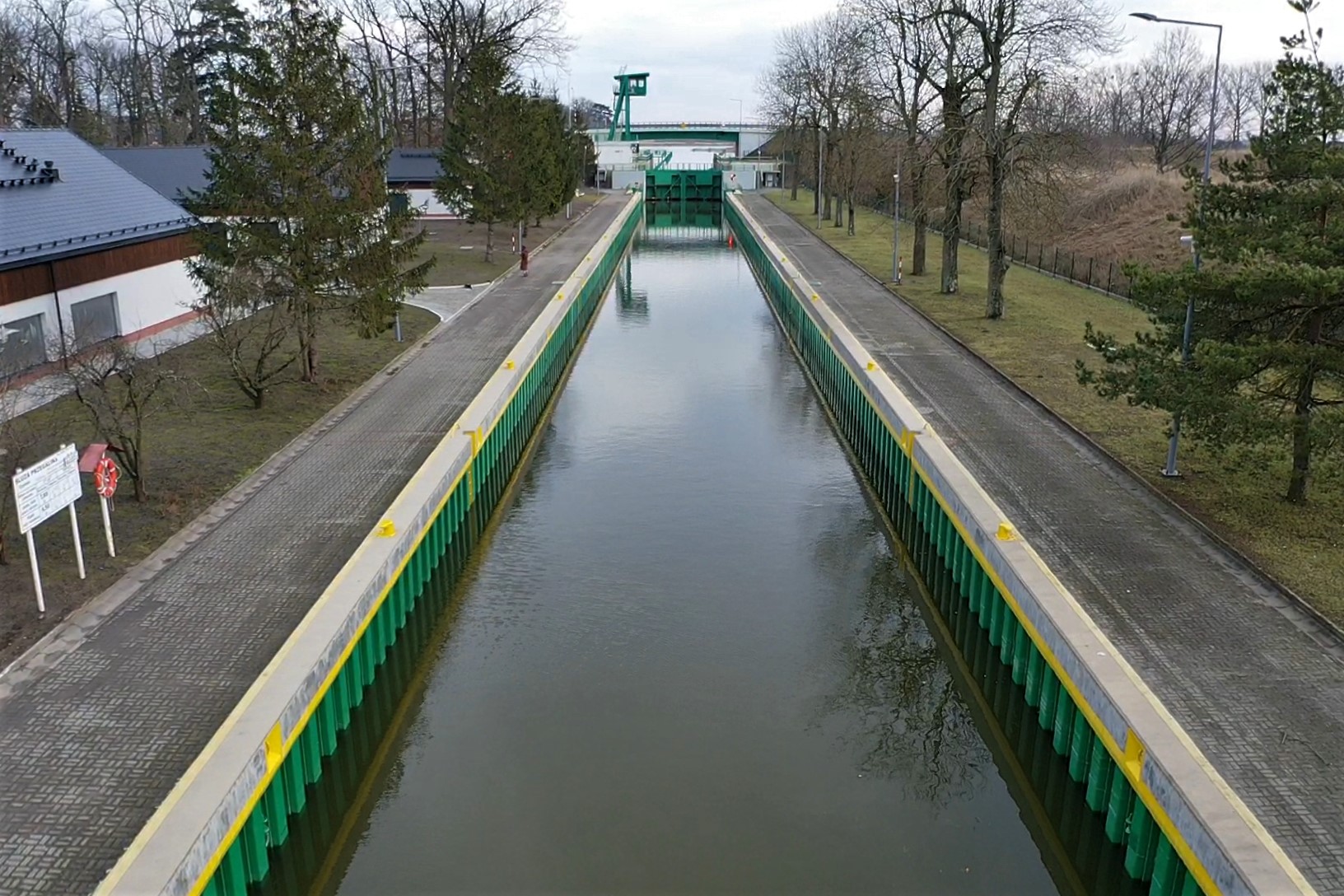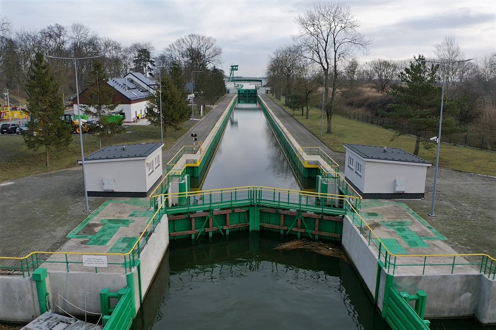 Górne wrota śluzowe pełnią jednocześnie rolę wrót przeciwpowodziowych.