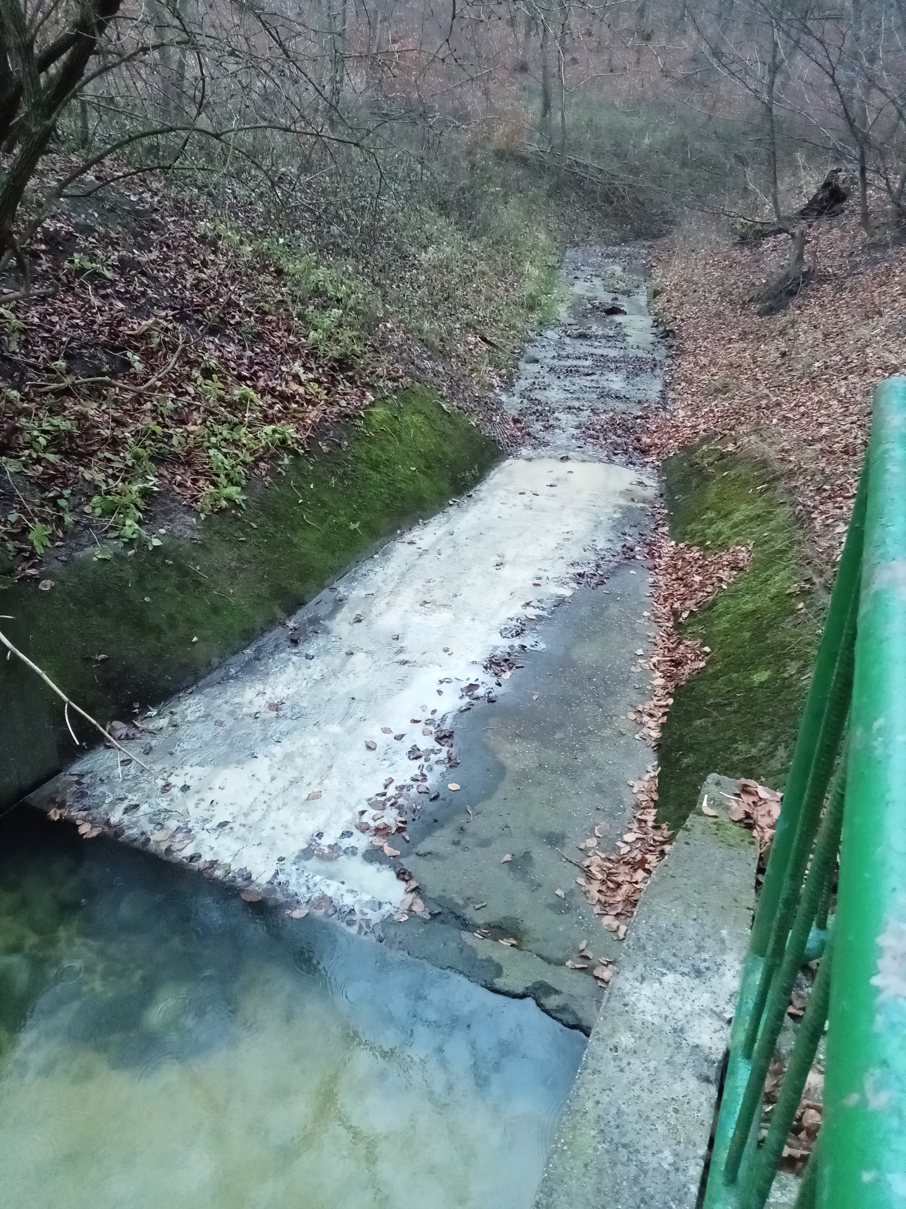 - po przyjęciu zgłoszenia (08.12.2025 r) dokonano wizji w terenie, która potwierdziła występowanie zanieczyszczenia — białego osadu, bez zapachu - na wylocie z betonowego odcinka Potoku Przemysłowego. Potok Przemysłowy powyżej przebiega przez tereny zurbanizowane miasta Gdynia — w rurociągu podziemnym,