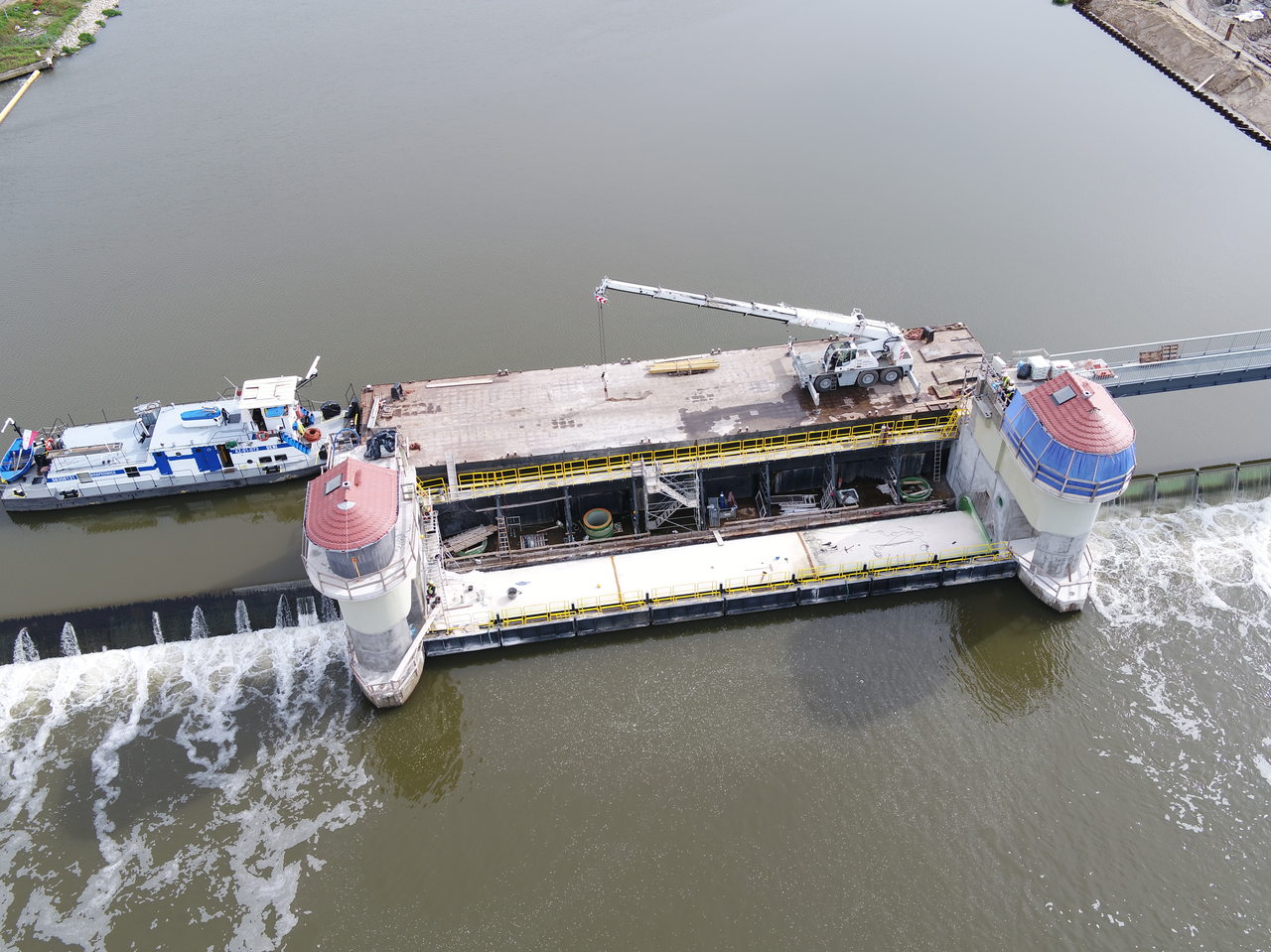 - przebudowy tam rozdzielczych obejmujące wykonanie stalowych ścianek podpierających ubezpieczenia skarp, wykonanie nowych korpusów tam i nowych betonowych ubezpieczeń skarpowych,
