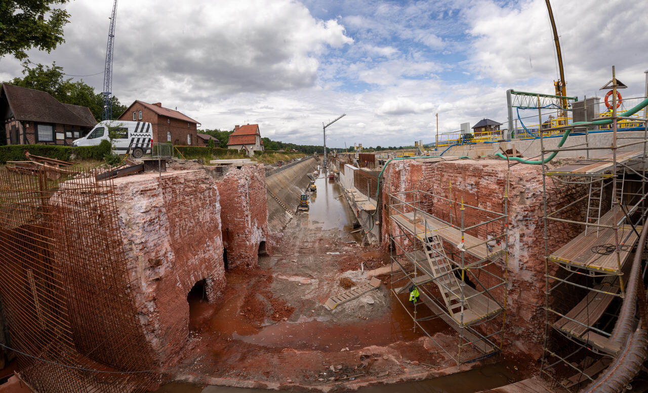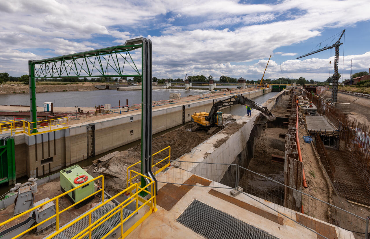 - roboty konstrukcyjne śluzy nowej – zbrojenie, osadzanie elementów stalowych, deskowanie i betonowanie konstrukcji głów (górnej, pośredniej i dolnej) i komór śluzy, izolacja powierzchni zewnętrznych i obsypki z zagęszczeniem, montaż wrót i zasuw wraz z napędami hydraulicznymi i zasilaczami,