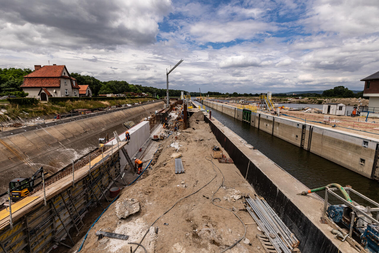 - przebudowę istniejącej śluzy małej poprzez jej częściową rozbiórkę i budowę w jej miejscu śluzy o parametrach 190m długości użytkowej i 12m szerokości użytkowej wraz z wyposażeniem technicznym, mechanicznym i hydraulicznym