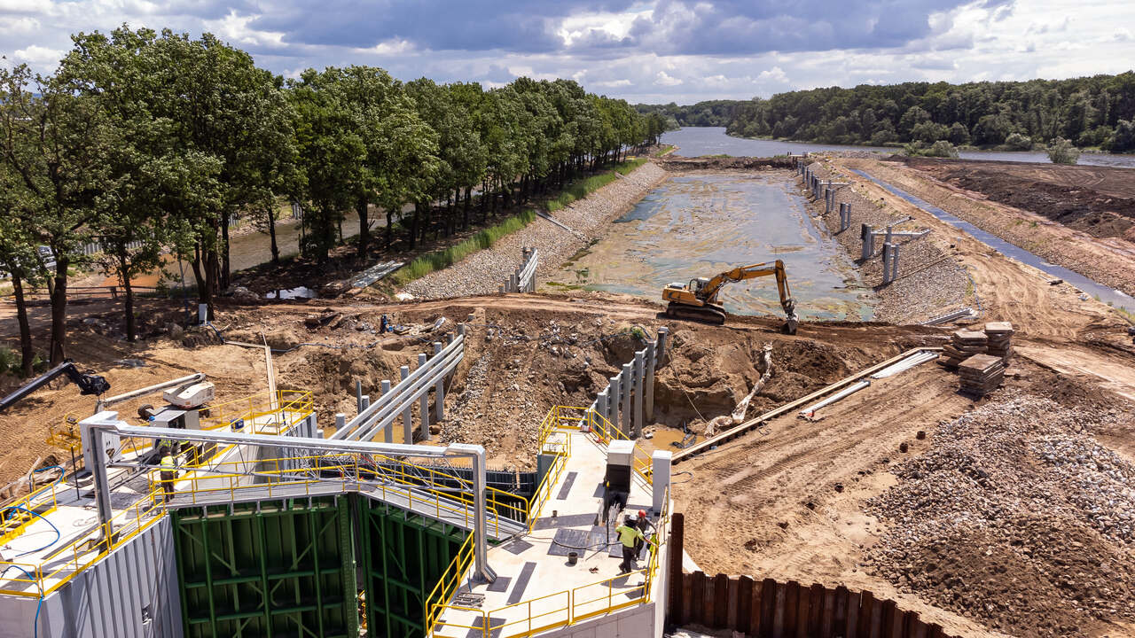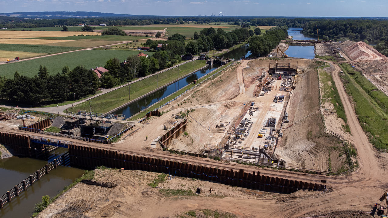 - roboty konstrukcyjne śluzy nowej – zbrojenie, osadzanie elementów stalowych, deskowanie i betonowanie konstrukcji głów (górnej, pośredniej i dolnej) oraz dna i komory śluzy, izolacja powierzchni zewnętrznych i obsypki z zagęszczeniem,