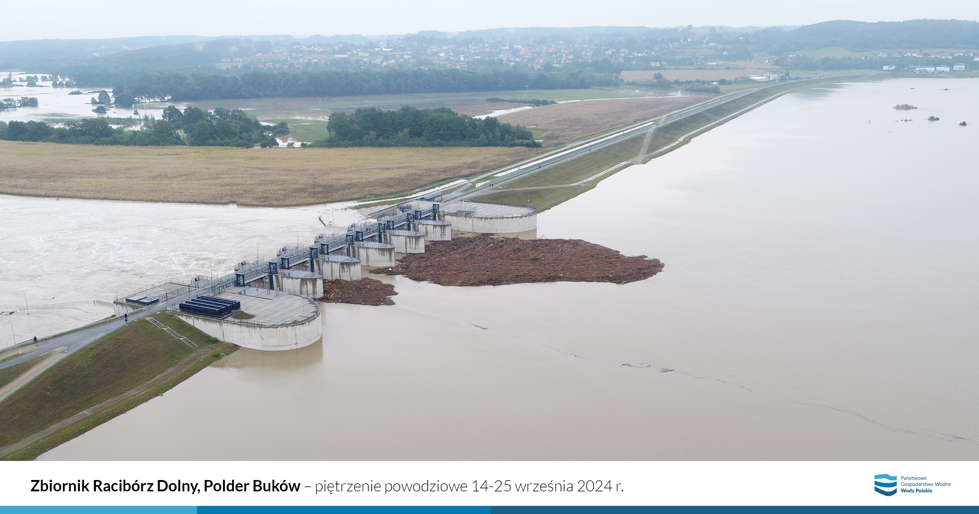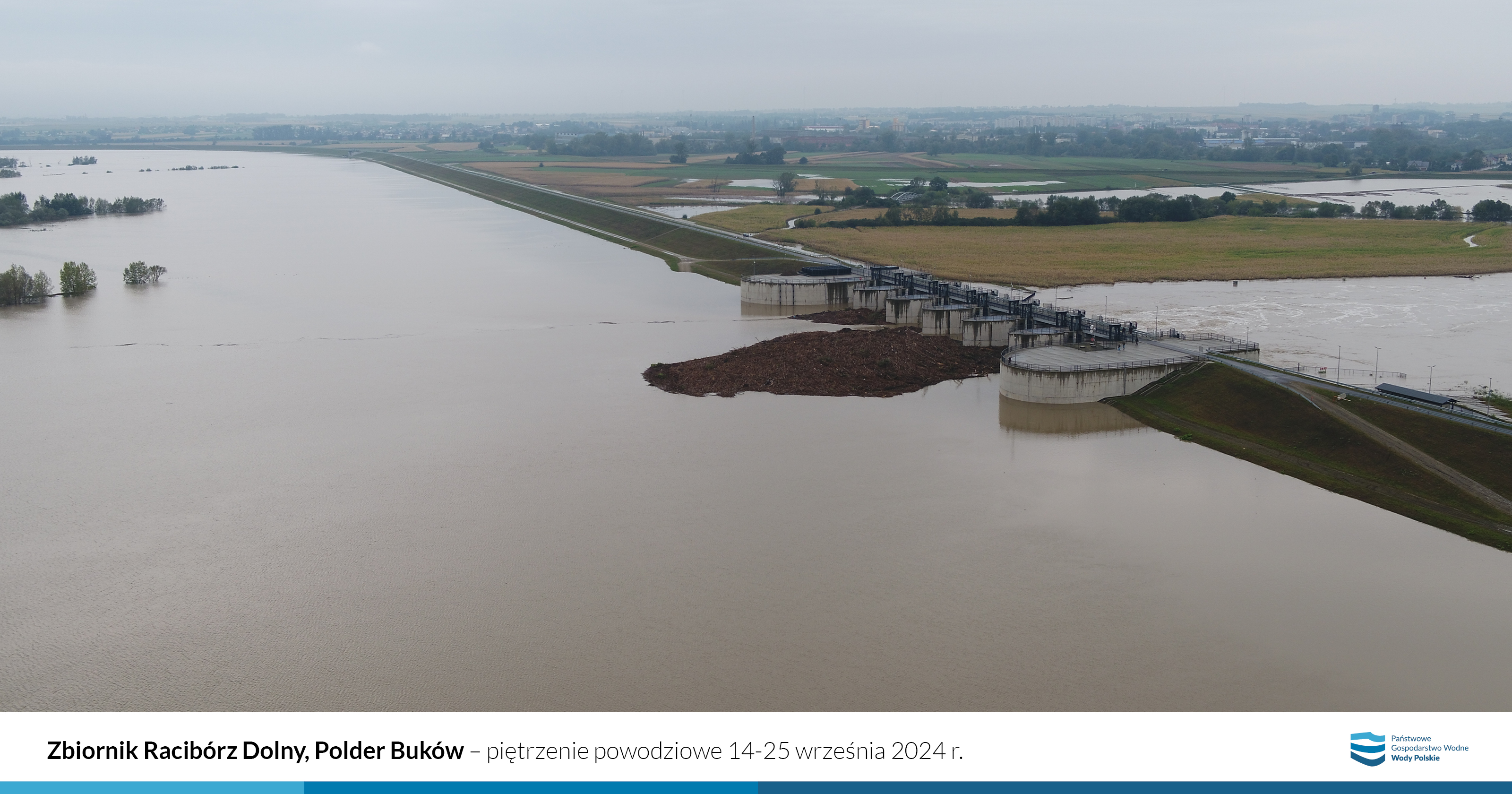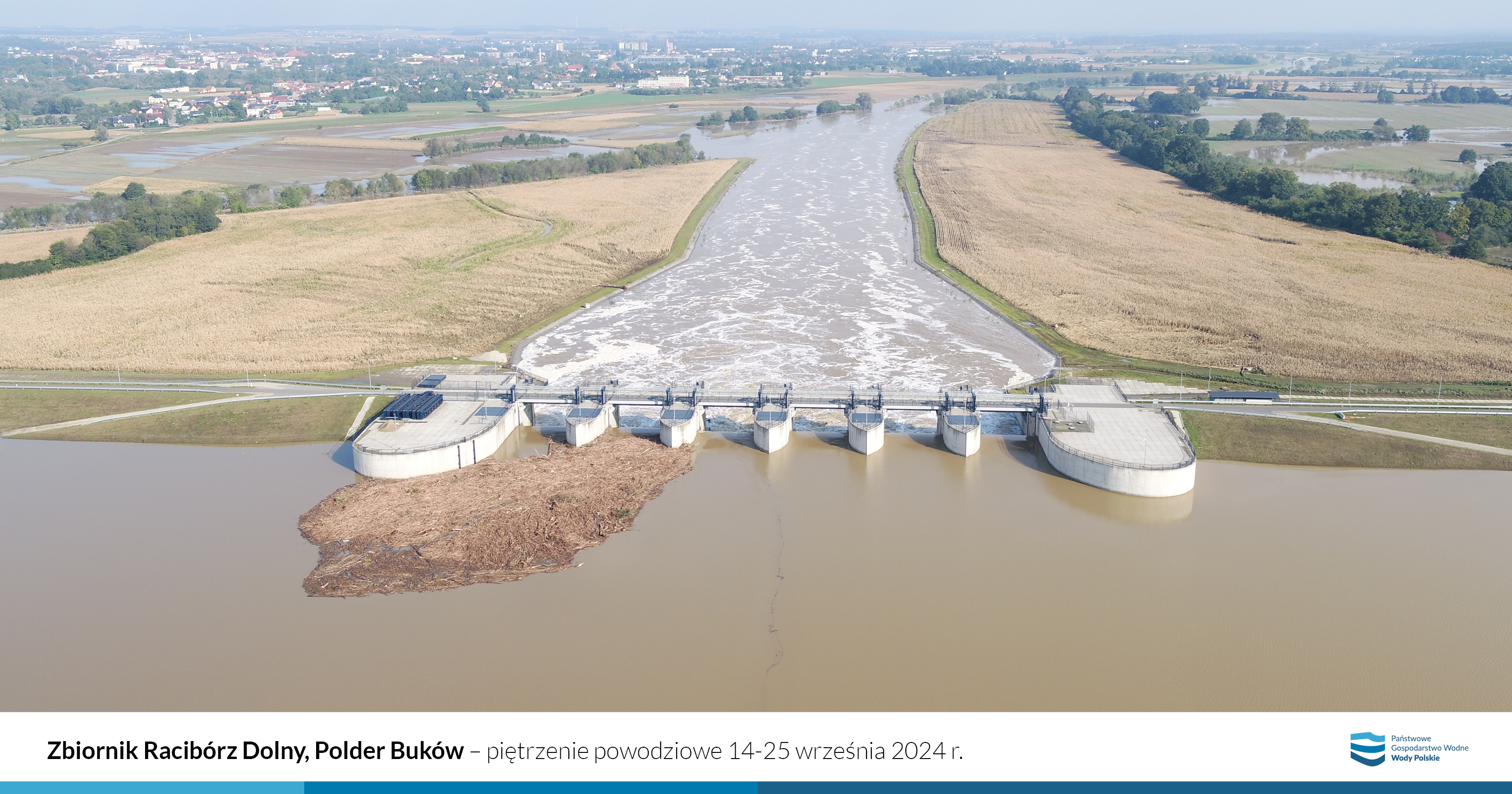 W niedzielę 15 września 2024 r. około godziny 4:20 Zbiornik Racibórz Dolny rozpoczął piętrzenie wezbranych wód rzeki Odry, przechwytując falę powodziową i jednocześnie ją spłaszczając. O uruchomieniu obiektu zadecydował zespół wskazany w Instrukcji Gospodarowania Wodą. Zasuwy Budowli Przelewowo-Spustowej zbiornika zostały opuszczone gdy posterunek wodowskazowy Krzyżanowice w zlewni Górnej Odry wskazywał rzędną ok. 690 cm przy przepływie ok. 750 m3/s. Równocześnie swoją pracę rozpoczął Polder Buków stanowiący pobliskie wsparcie dla zbiornika Racibórz. Przez cały czas zespół specjalistów nadzorował prawidłowe działanie obydwu obiektów hydrotechnicznych.