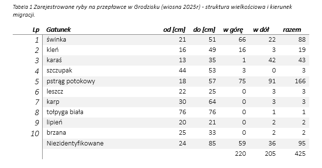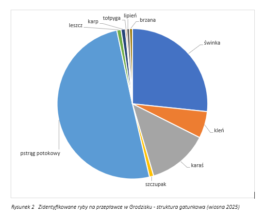 W badanym okresie tj. 9 marca 2025r (godz. 16:34) do 4 czerwca 2025r (godz. 18:13) licznik zarejestrował 425 ryb: 220 z nich przepłynęło w górę i 205 – w dół. Spośród tych ryb dość duży był odsetek ryb nizidentyfikowanych (kategorie: generic, no video) - 95, co stanowi 22,4% całości. Ogółem zidentyfikowano 330 ryb, które reprezentowały 10 gatunków. Najliczniejsze były pstrągi potokowe, stanowiące 50,3% wszystkich zidentyfikowanych ryb. Kolejnymi w kolejności udziału była świnka (26,7%) oraz karaś (13%). Wykres obrazujący strukturę gatunkową zidentyfikowanych ryb w przepławce w m. Grodzisko jest przedstawiony poniżej, w galerii.