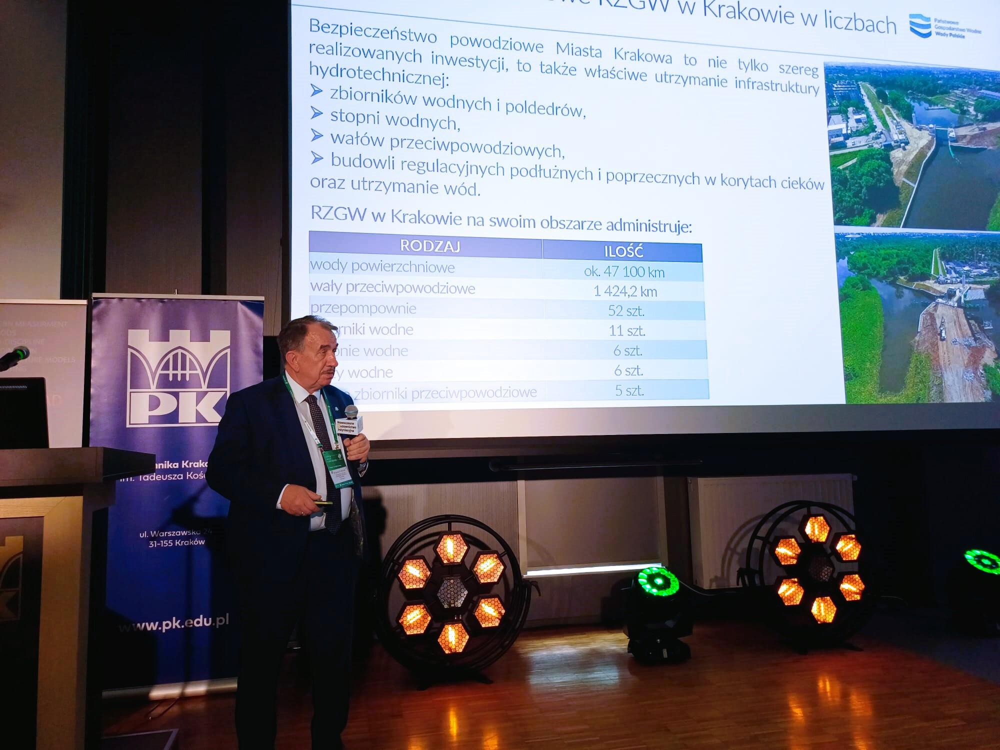 Podczas sesji hydrotechnicznej Dyrektor RZGW w Krakowie Wojciech Kozak omówił zrealizowane projekty ochrony przeciwpowodziowej Krakowa min.