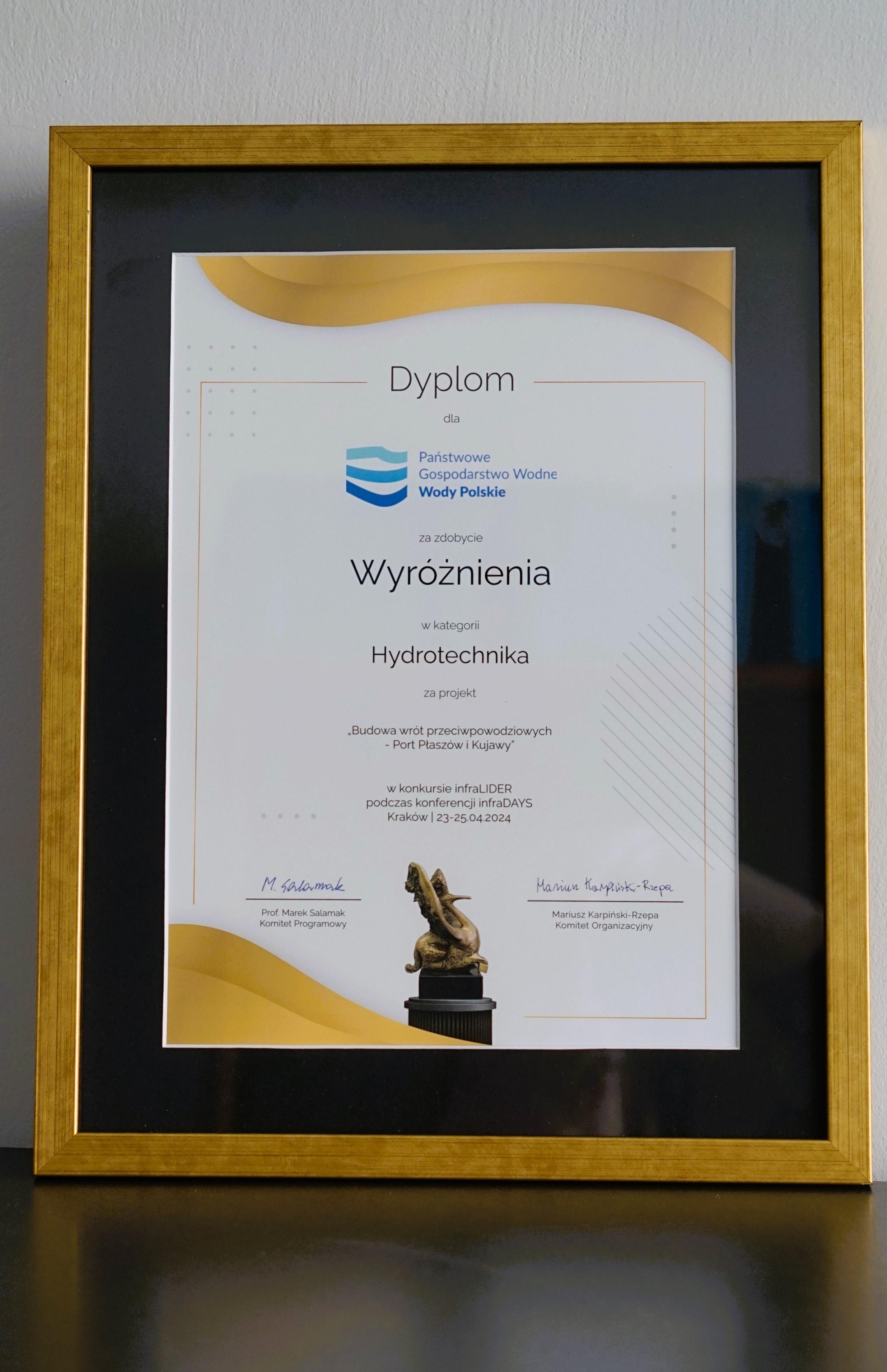 W trakcie konferencji na ręce Pana Dyrektora wręczone zostało również wyróżnienie w konkursie infraLIDER za projekt „Budowa wrót przeciwpowodziowych – Port Płaszów i Kujawy”