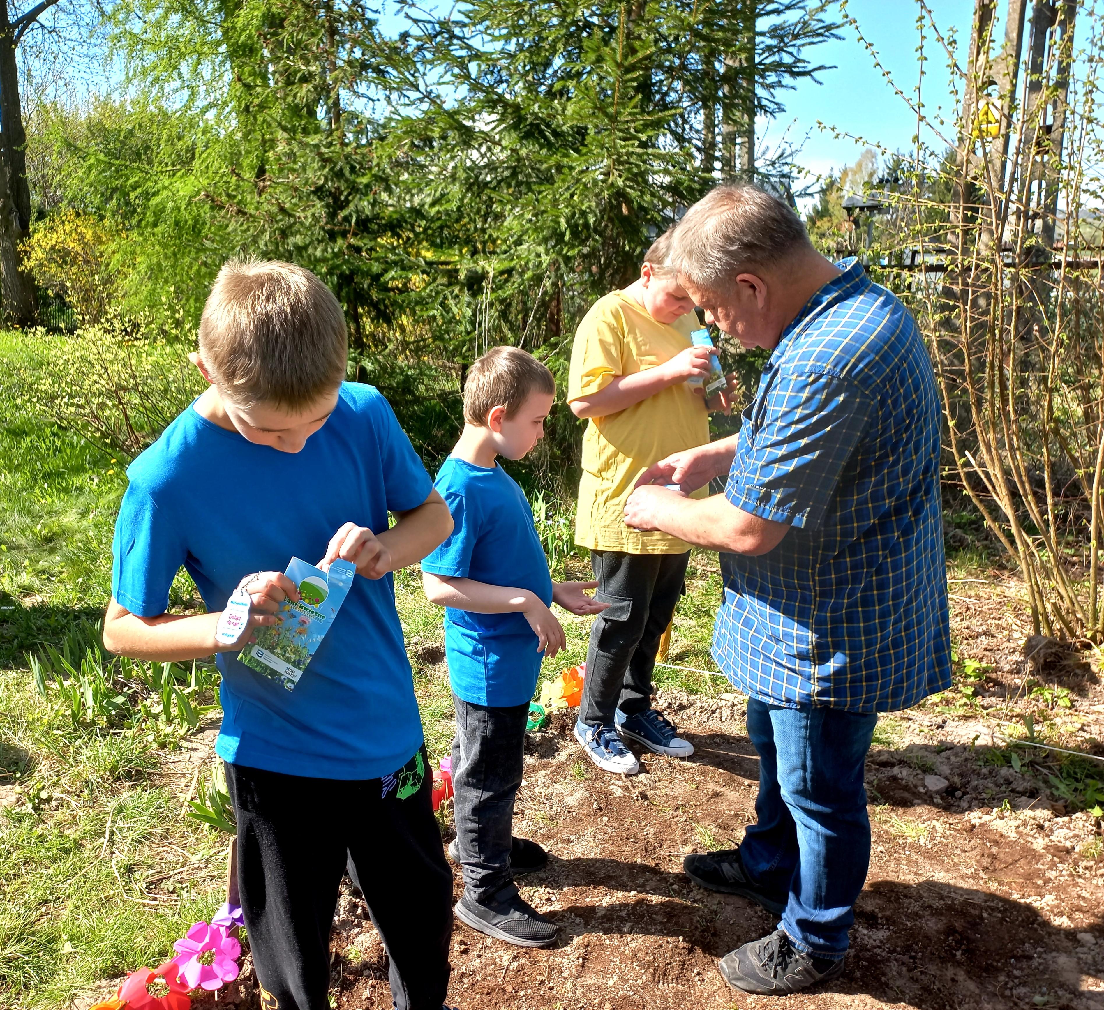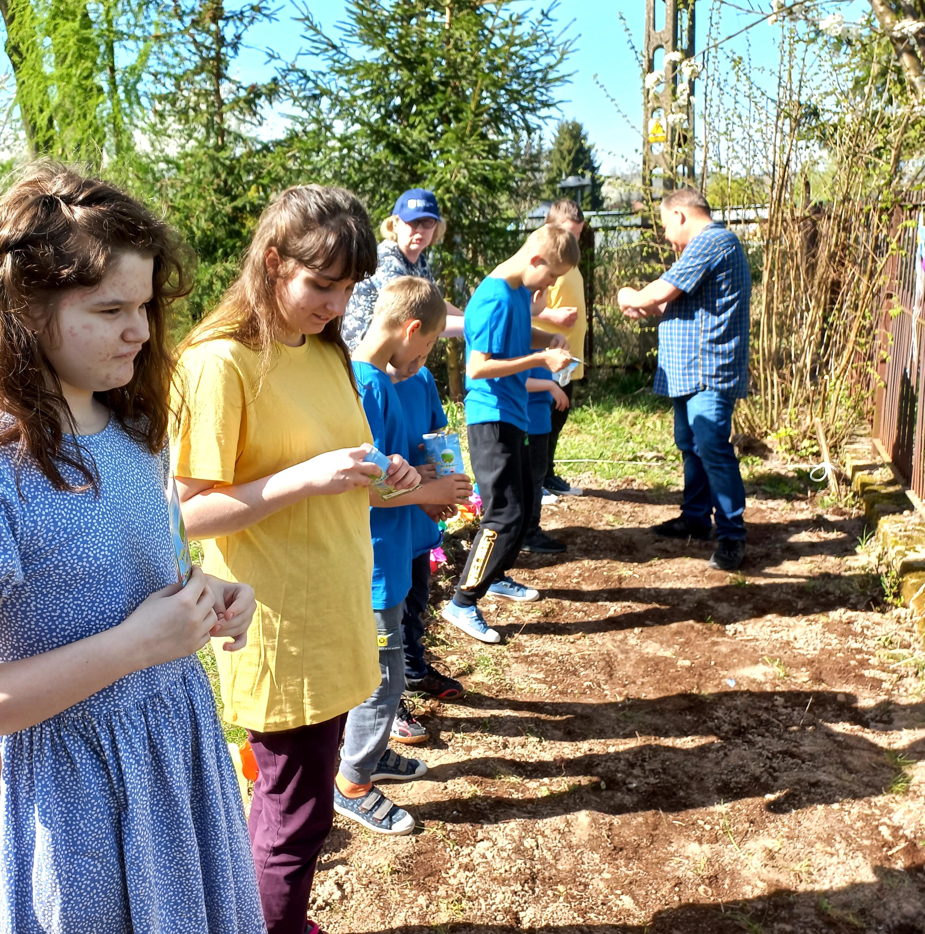 Uczniowie z dużą starannością usunęli z przekopanej ziemi pozostałości chwastów, wyrównali spulchniony grunt, równomiernie rozsypali nasiona i rozrzucili kule nasienne. Następnie delikatnie udeptali obsianą glebę, która została później podlana.