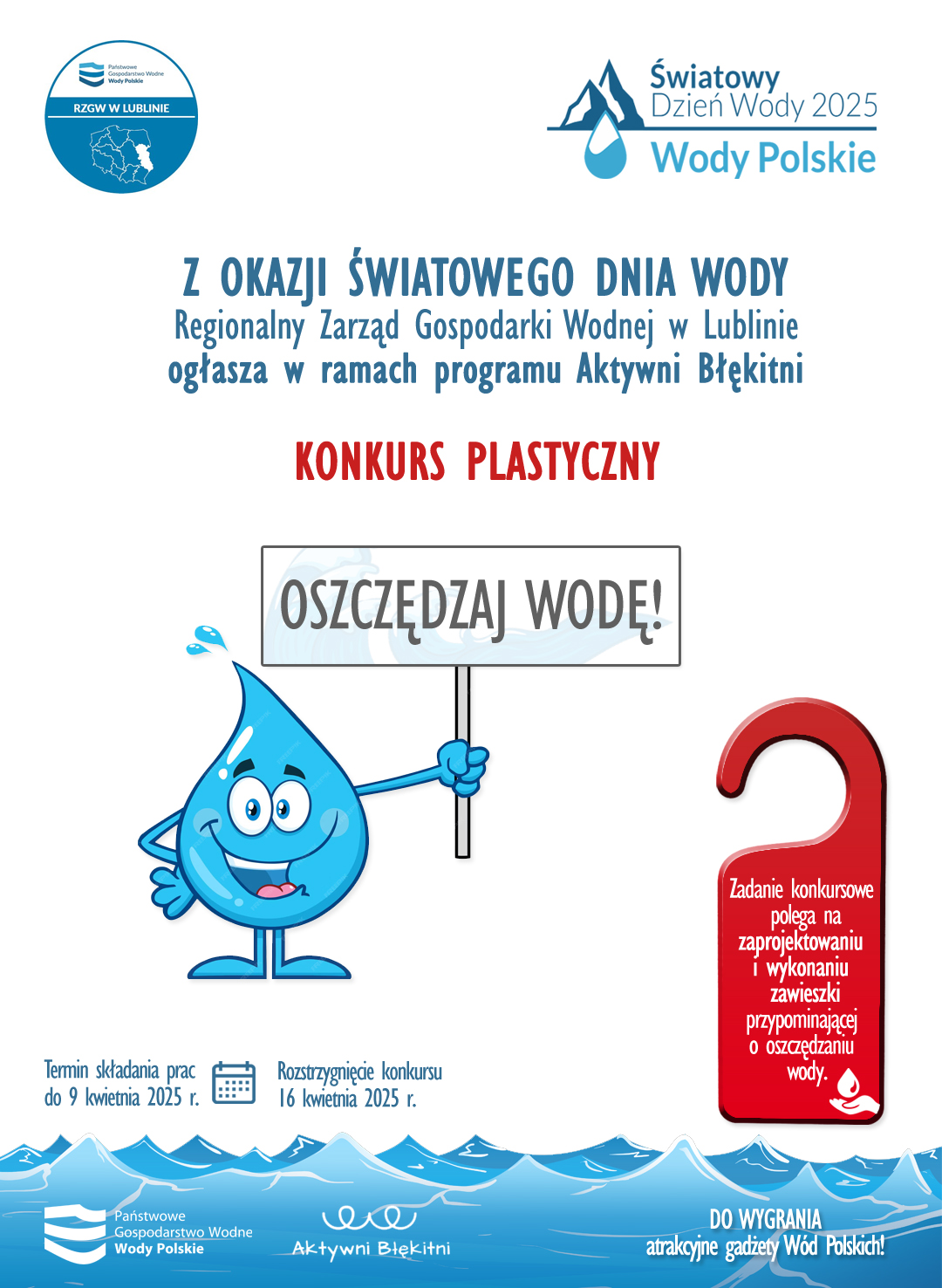 Zadanie konkursowe polega na zaprojektowaniu i wykonaniu zawieszki przypominającej o oszczędzaniu wody – technika dowolna.
