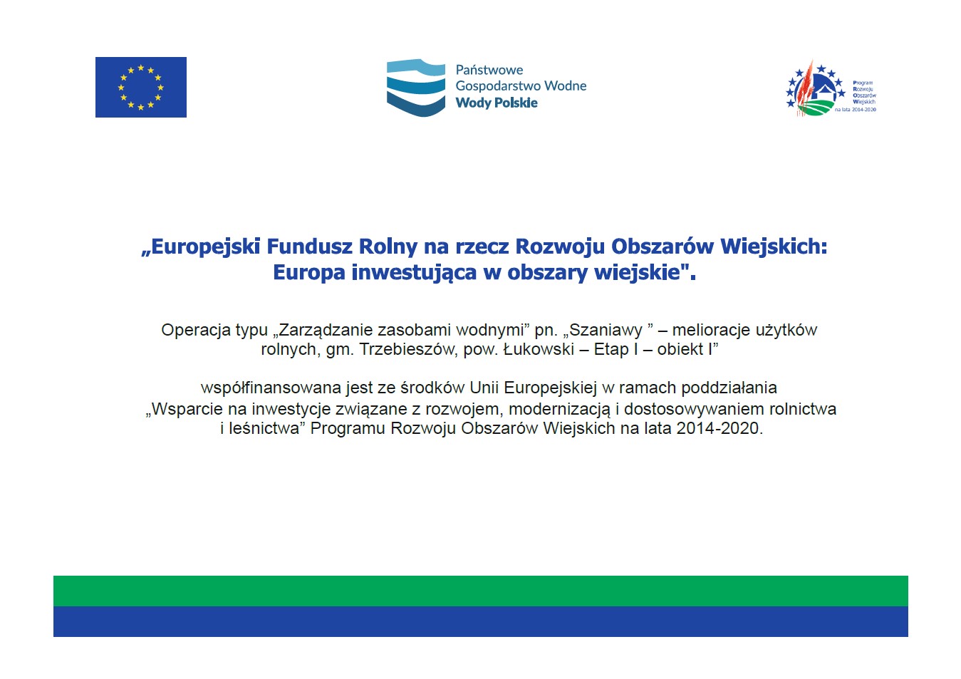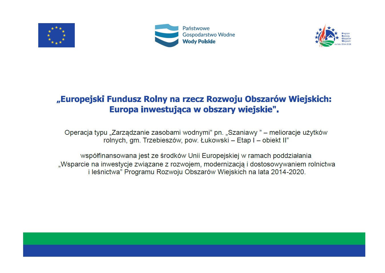 Przedmiotowe inwestycje realizowane są w ramach przyznanej pomocy na operacje typu „Zarządzanie zasobami wodnymi” w podzadaniu „Wsparcie na inwestycje związane z rozwojem, modernizacją i dostosowaniem rolnictwa i leśnictwa” objętego Programem Rozwoju Obszarów Wiejskich na lata 2014 – 2020 dla zadania inwestycyjnego pn. „Szaniawy - melioracje użytków rolnych, gm. Trzebieszów, pow. Łukowski – etap I” i finansowane w 100% z przedmiotowego programu.