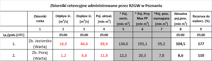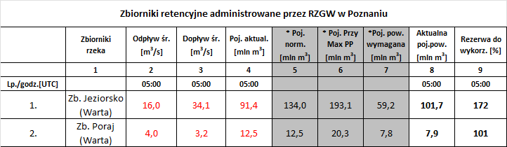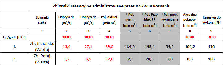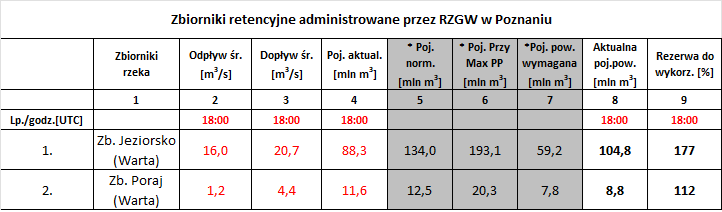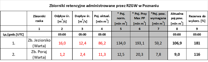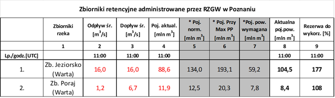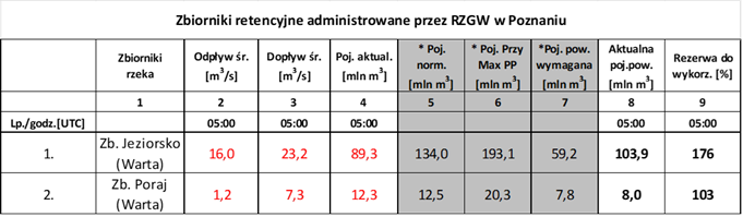 W regionie wodnym Warty minionej doby odnotowano przeważnie spadki stanów, lokalnie wzrosty związane ze spływem wód opadowych; zmiany w strefie niskich lub średnich, lokalnie też w wysokich. Na Warcie do zbiornika Poraj wahania ze wzrostem stanów w strefie średnich. Bezpośrednio poniżej zbiornika Poraj wzrost o 30 cm, m.in. z uwagi na zmianę odpływu ze zbiornika. Dalej do stacji Bobry kilkucentymetrowe spadki, poniżej do zbiornika Jeziorsko niewielkie wzrosty w strefie stanów średnich i niskich. Na dopływach tego odcinka przeważnie spadek, do kilkunastu cm. Zmiany w strefie stanów średnich, wysokich (na Grabi z przekroczeniem ostrzegawczego), lokalnie w niskich. Na Warcie poniżej zbiornika Jeziorsko stany wody w strefie niskich. Na dopływach Warty do ujścia Prosny przeważnie wahania ze wzrostem, poniżej ze spadkiem bądź stabilizacja, zmiany w strefie niskich i średnich. Większe zmiany na Wrześnicy – wzrost o 22 cm do strefy stanów wysokich.