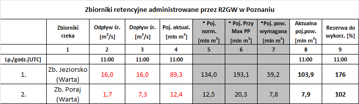 Parametry zbiorników z godz. 13:00 (11:00 UTC) przedstawiają się następująco.