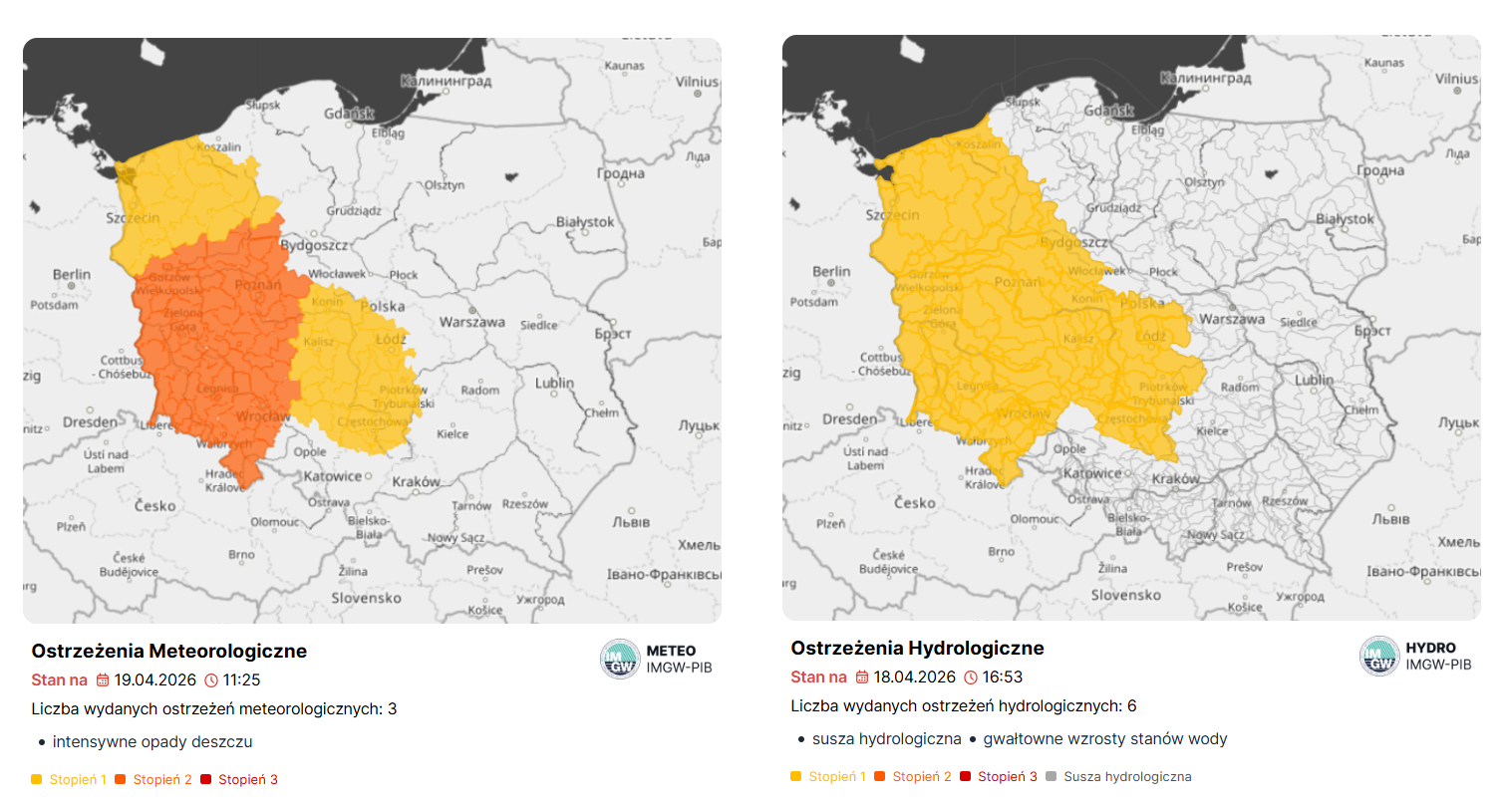 - ostrzeżenie meteorologiczne II stopnia dotyczące intensywnych opadów deszczu dla zachodniej i centralnej części regionu wodnego Warty (ważne od godziny 15:00 19.04.2026 r.) oraz I stopnia dla wschodniej i południowej części regionu (ważne od godziny 22:00 19.04.2026 r.)