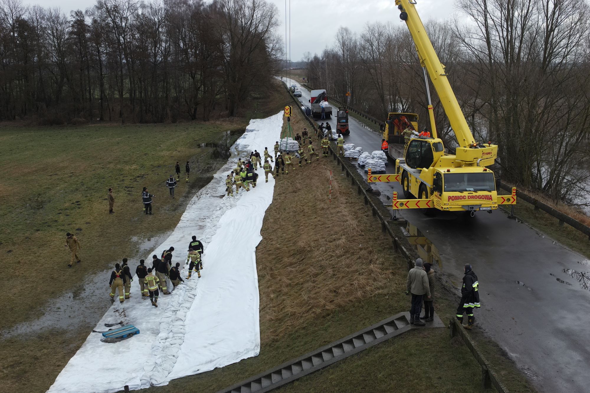Z powodu zalania zamknięto również drogę z kościańskiego Gurostwa do Nielęgowa oraz pomiędzy Nielęgowem i Gryżyną. W związku z powyższą sytuacją, od niedzielnego poranka tj. 18 lutego br., strażacy z PSP w Kościanie wraz z okolicznymi jednostkami OSP zabezpieczali najbardziej zagrożone miejsca. Na miejscu pracowało ok. 70 osób. Szczególnym monitoringiem objęto również zbiornik wodny Wonieść retencjonujący wody spływające w kierunku Kościana. W działaniach uczestniczyli przedstawiciele Wód Polskich, nadzorując układnie worków. Na miejscu obecni byli: Dyrektor RZGW w Poznaniu Bogumił Nowak, Dyrektor Zarządu Zlewni w Poznaniu Artur Grześkowiak, Kierownik Nadzoru Wodnego w Kościanie Marcin Waligóra, Inspektor Nadzoru Inwestorskiego Hubert Józefowski oraz operator drona Błażej Waligórski.