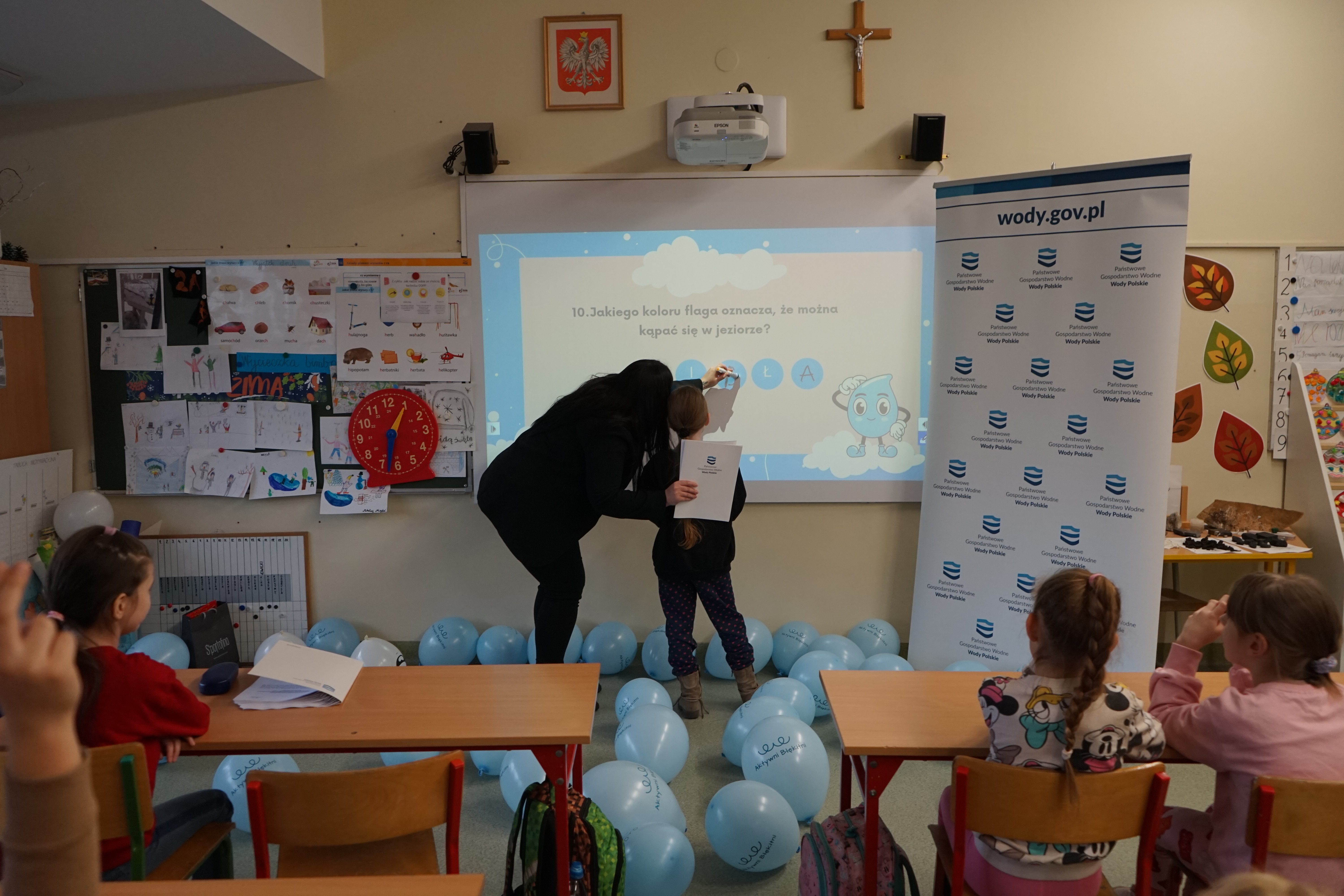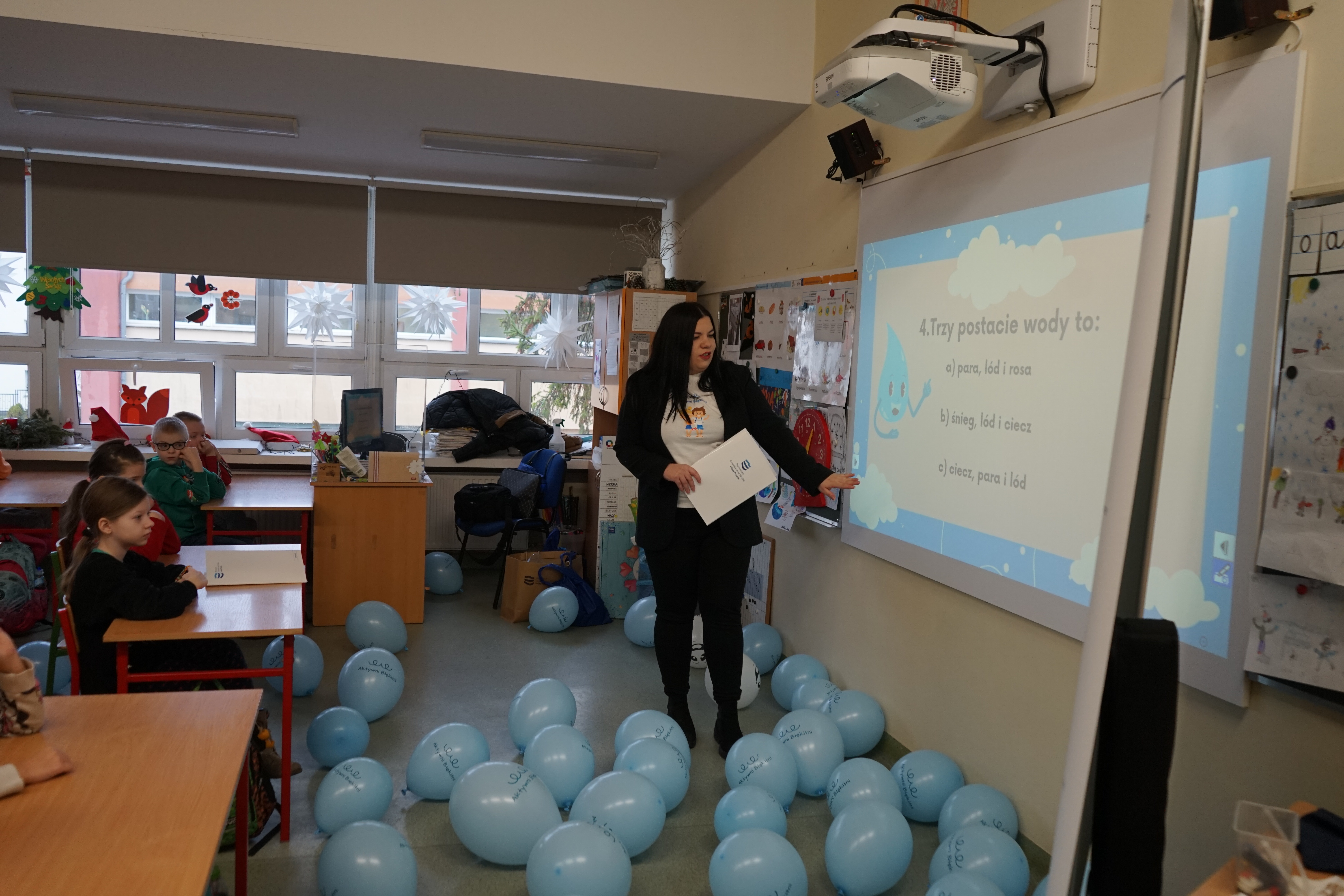 Po przedstawieniu działalności Wód Polskich oraz Regionalnego Zarządu Gospodarki Wodnej w Poznaniu omówiliśmy trzy kampanie społeczne realizowane przez PGW Wody Polskie – Stop Suszy, Stop Powodzi oraz Woda To Nie Śmietnik. W drugiej części lekcji odbył się konkurs wiedzy o wodzie. Uczniowie rywalizowali ze sobą, odgadując, jakie litery brakują w wodnych hasłach. Na tablicy pojawiły się również pytania oraz trzy możliwości odpowiedzi, z których tylko jedna z nich była prawidłowa. To była zdrowa rywalizacja - uczniowie nie mieli najmniejszych problemów ze wskazaniem poprawnej odpowiedzi. Na zakończenie lekcji omówiliśmy bezpieczne korzystanie z rekreacji wodnej podczas nadchodzących ferii zimowych.