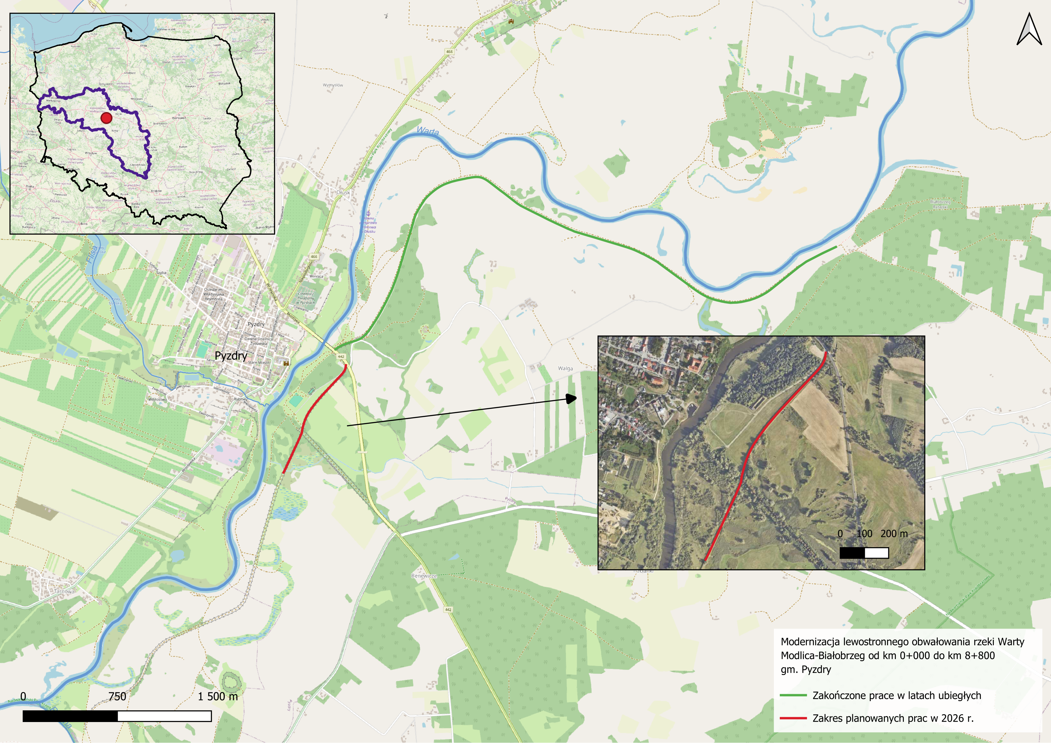 Dnia 5 lutego 2026 r. Regionalny Zarząd Gospodarki Wodnej w Poznaniu ogłosił postępowanie przetargowe na realizację kolejnego etapu zadania inwestycyjnego pn. „Modernizacja lewostronnego obwałowania rzeki Warty Modlica-Białobrzeg od km 0+000 do km 8+800, gm. Pyzdry”. Inwestycja obejmuje 1 010 metrów wału i stanowi kolejny etap wieloletniego projektu, którego celem jest dostosowanie obwałowania do aktualnych norm technicznych oraz zwiększenie bezpieczeństwa przeciwpowodziowego mieszkańców i infrastruktury położonej na lewym brzegu Warty.