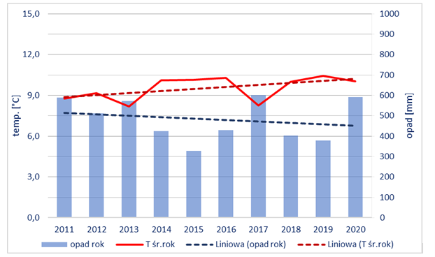 Biorąc pod uwagę dane za 10 lat w tzw. ujęciu hydrologicznym, tj. od listopada 2010 do października 2020 r., zauważyć można dodatni trend średniej rocznej temperatury powietrza, z przeciętnym wzrostem o 0,15°C na rok. Średnia temperatura roczna dla omawianych 10 lat wynosi 9,5°C. Dla lat 2014-2016 oraz 2019-2020 temperatura przekraczała 10,0°C. Wzrost średniej rocznej temperatury powietrza, który obserwujemy m.in. na tym obszarze przyczynia się do wydłużenia okresu wegetacyjnego i zwiększenia zapotrzebowania roślin na wodę.