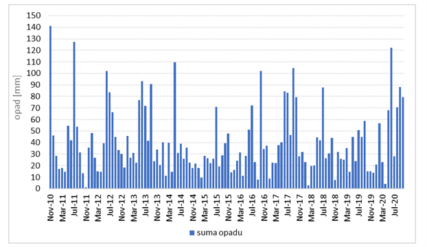 Powyższe dane są uśrednione i gdy analizie poddane zostaną dane dla poszczególnych miesięcy w wieloleciu (rys. 2.) zauważyć można, że w listopadzie 2010 spadło około 140 mm deszczu i był to najwyższy opad miesięczny dla całego wielolecia, stanowiąc prawie 400% średniego opadu dla tego miesiąca. Przechodząc do minimalnych sum miesięcznych opadów w listopadzie 2011 czy 2018 było to zaledwie kilka mm.