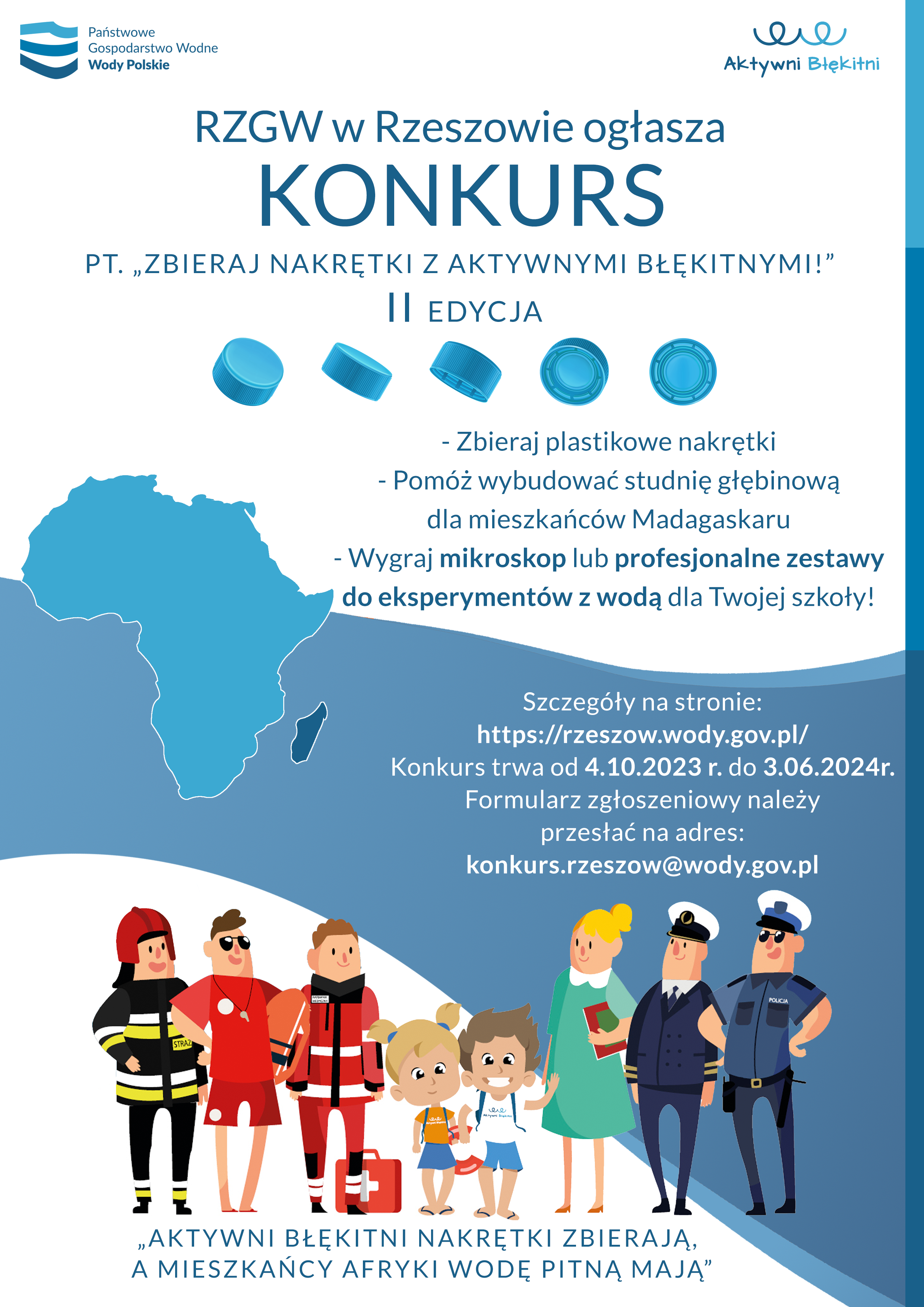Z przyjemnością informujemy, że znamy już wyniki II edycji konkursu pt. „Zbieraj nakrętki z Aktywnymi Błękitnymi”. Konkurs skierowany był do szkół podstawowych z terenów administrowanych przez RZGW w Rzeszowie, zgłoszonych do programu „Aktywni Błękitni – Szkoła Przyjazna Wodzie” w roku szkolnym 2023/2024.